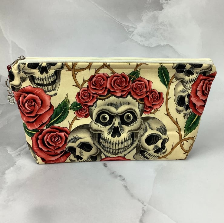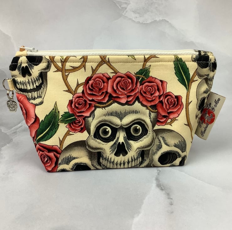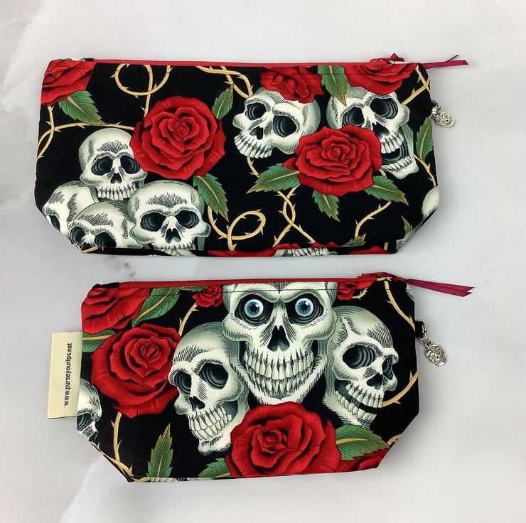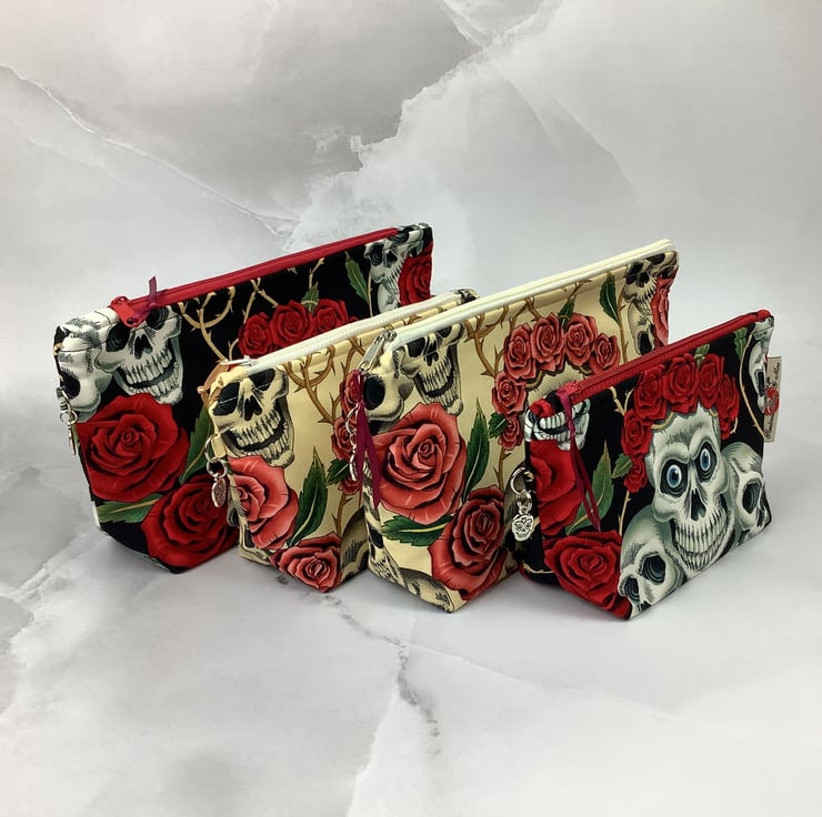 Handmade flat bottomed zip bag in a striking classic gothic cotton fabric a choice of colours and 2 sizes.