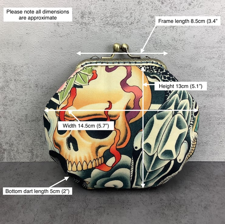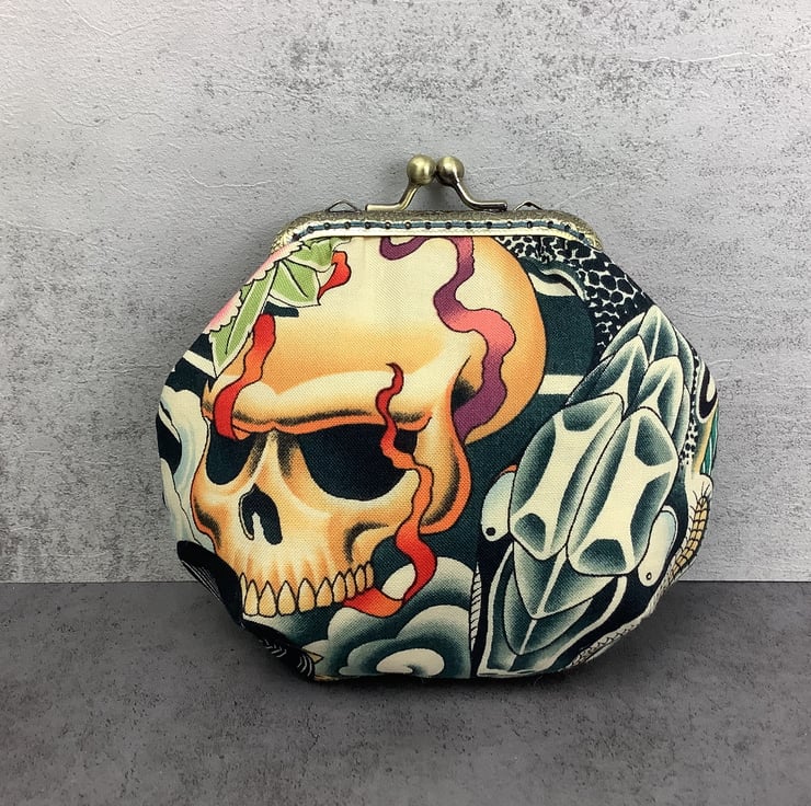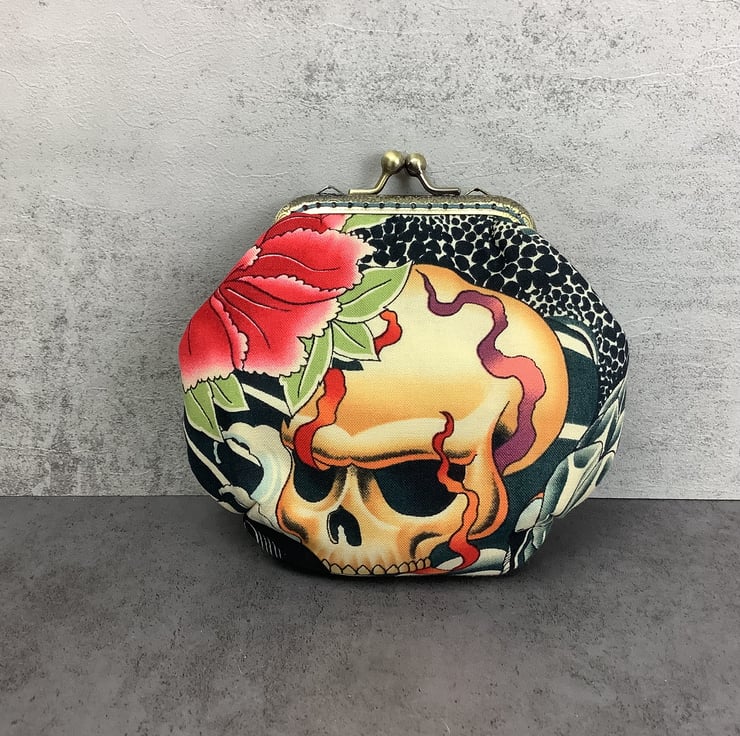 Handmade kiss clasp coin purse in a striking and unusual Japanese inspired gothic cotton fabric.