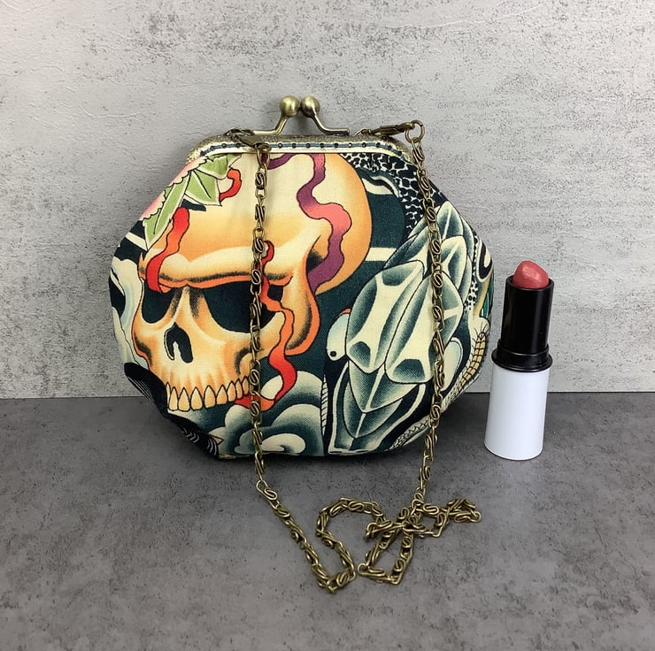 I love all things gothic and am fascinated by snakes. I am an also a real fan of a kiss lock purse. I love the snap when you close them. So the opportunity to combine this stunning skulls and snakes fabric into purses and bags was irresistable.