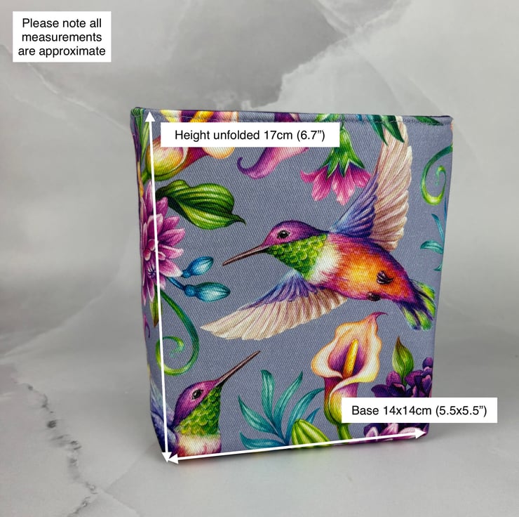 Each of my unique fabric baskets is individually made by me in my relaxing and tranquil little West Sussex garden studio so the pattern placement may vary slightly.
