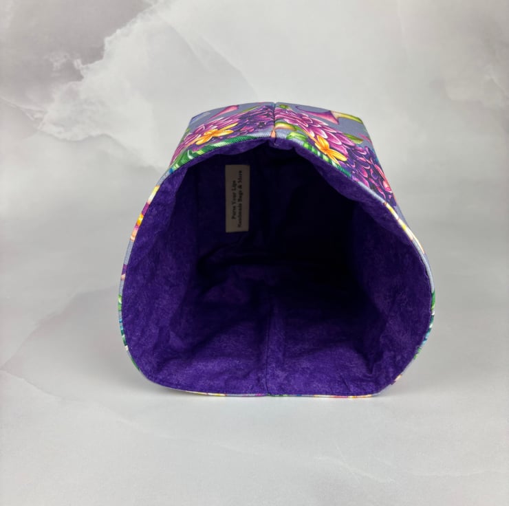 Handmade fabric basket in a pretty tropical heavy cotton fabric and lined in a rich purple cotton.