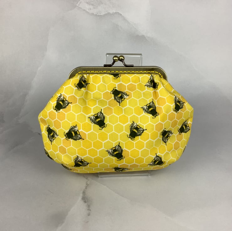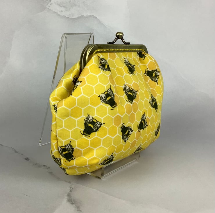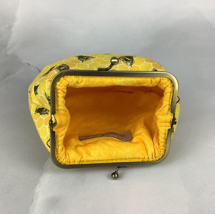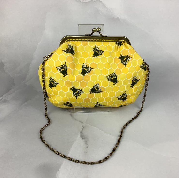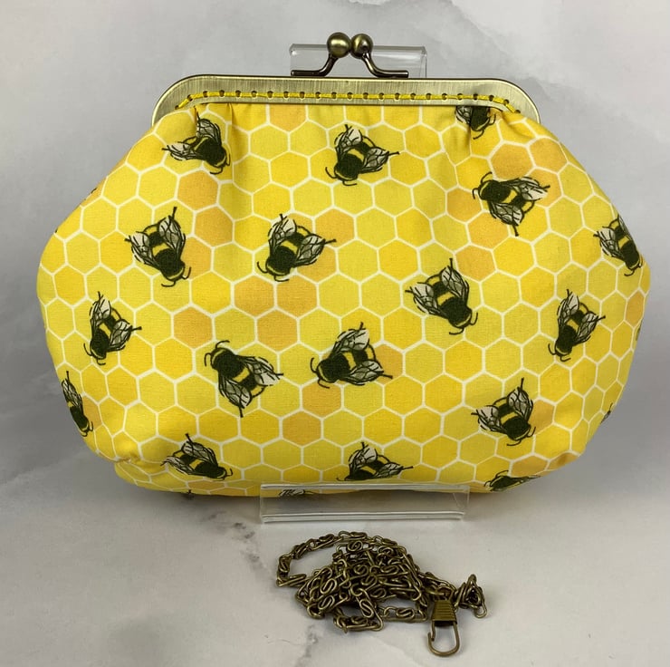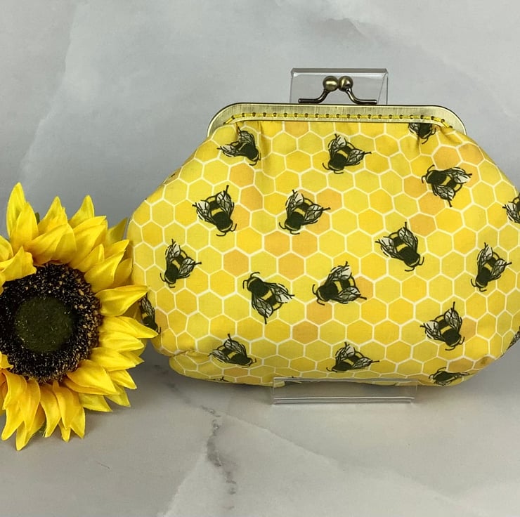 Handmade bag with a kiss clasp frame in a fun bumble bees cotton fabric.