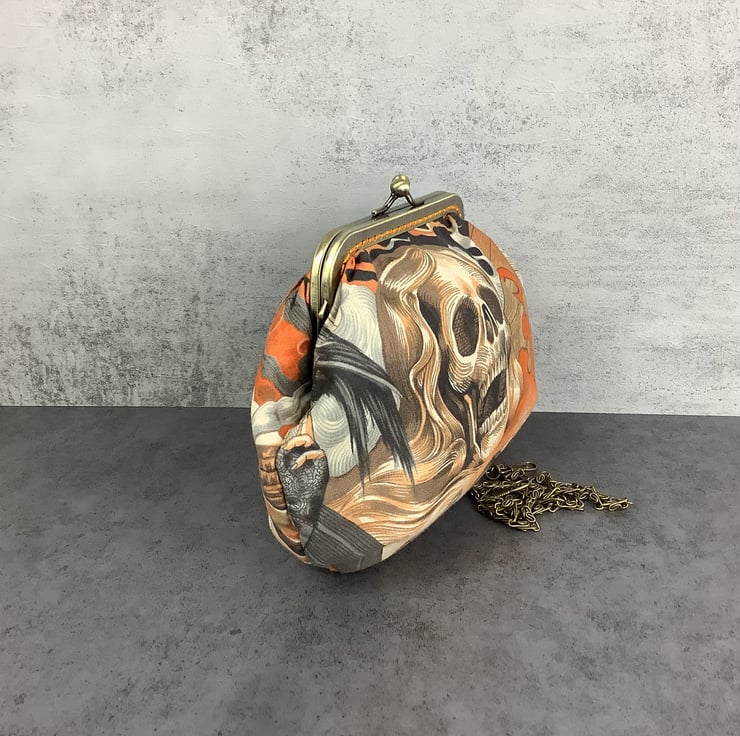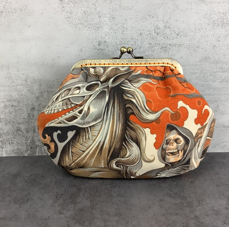 Handmade bag with a kiss clasp frame in stunning and unusual gothic cotton fabric with a skull on one side and death rider on the other.