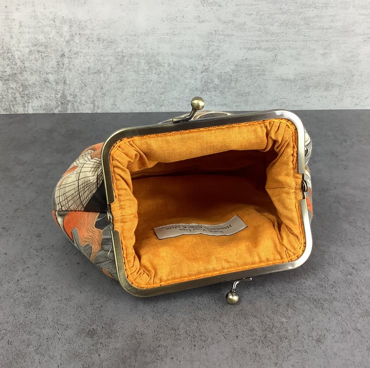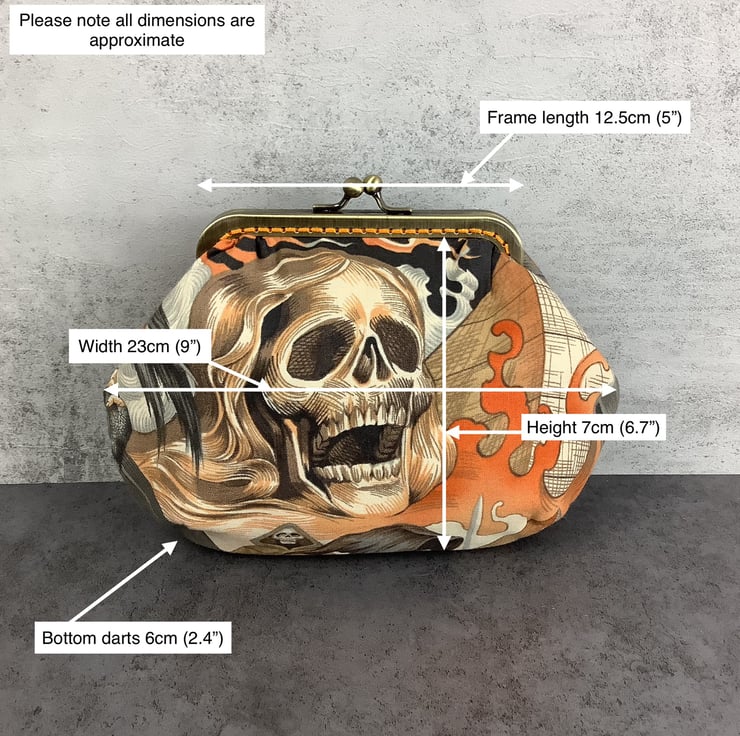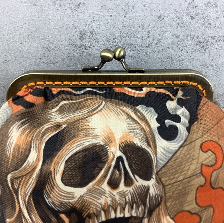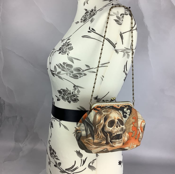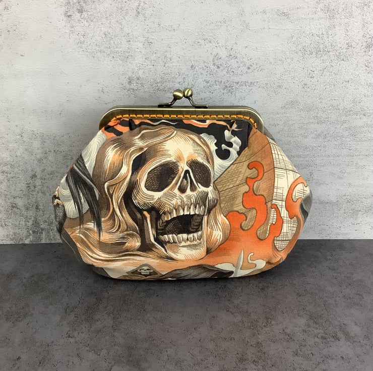 Handmade bag with a kiss clasp frame in stunning and unusual gothic cotton fabric with a skull on one side and death rider on the other.