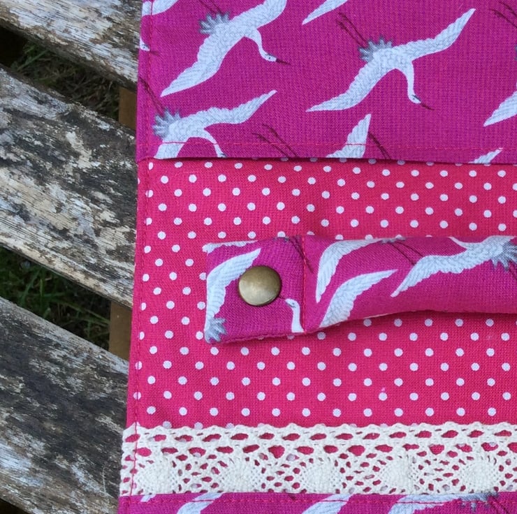 This unique jewellery roll is individually made by me in my relaxing and tranquil little West Sussex garden studio so the pattern placement may vary slightly.