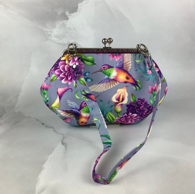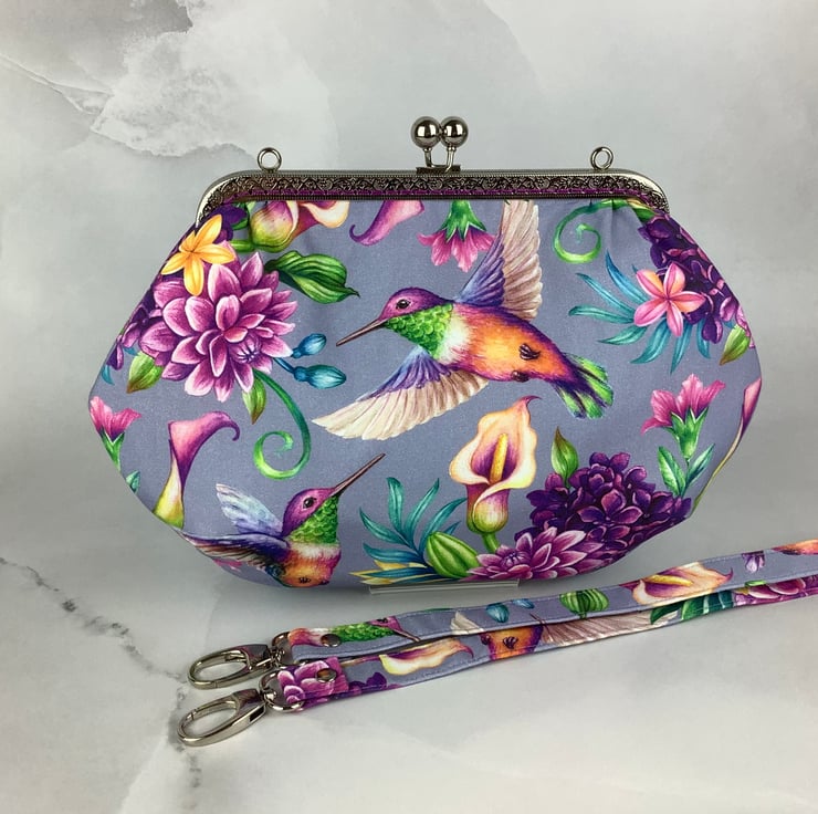 Handmade clutch bag with a kiss clasp frame in a beautiful cotton fabric with hovering birds surrounded by tropical flowers on a mauve background.