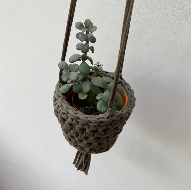 This planter would look lovely in a bathroom, bedroom or kitchen. It is crocheted by hand using tactile t-shirt yarn in a shade of dark khaki, formed from the off-cuts from the textile manufacturing process. So not only does it look pretty but it's sustainable too!