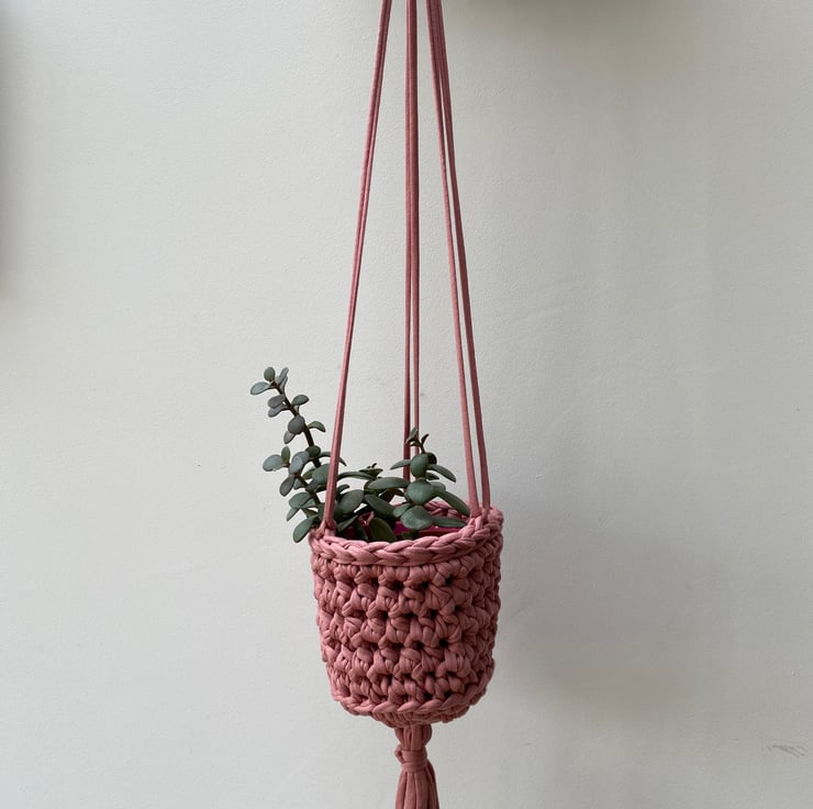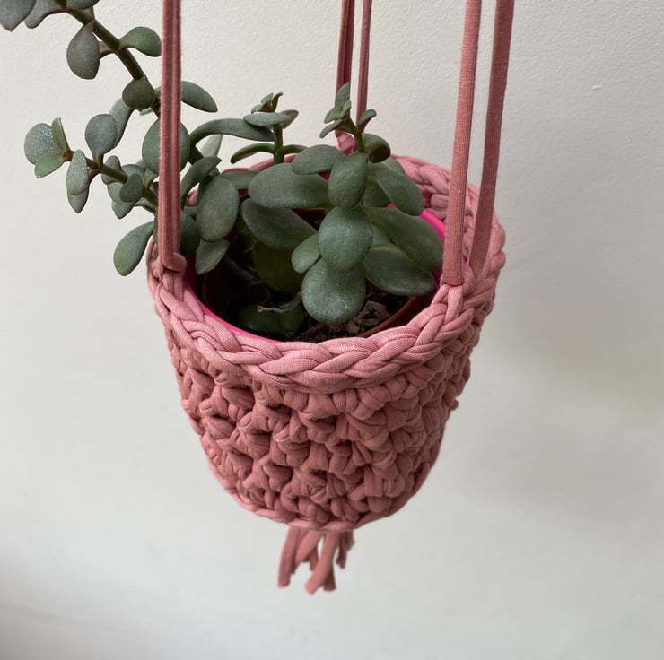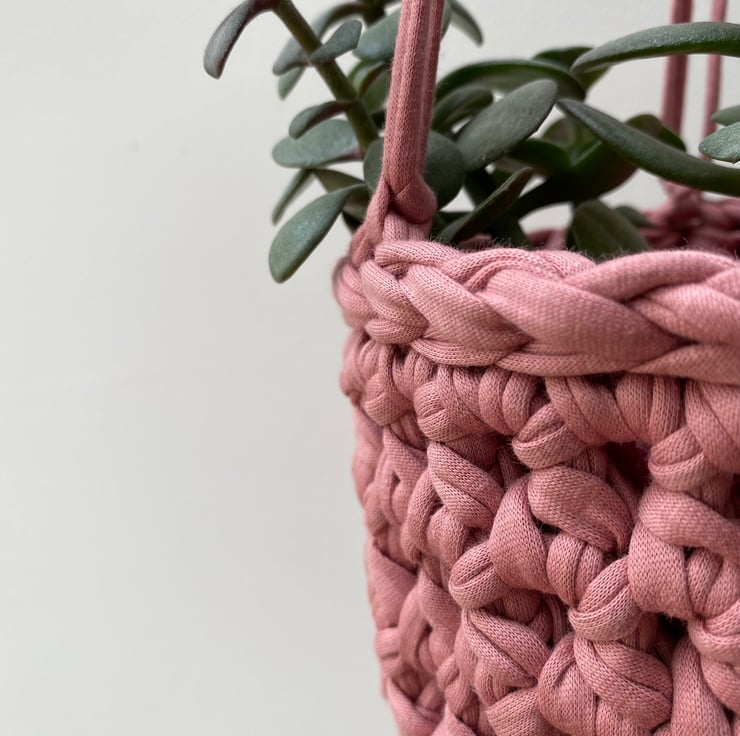 This planter would look lovely in a bathroom, bedroom or kitchen. It is crocheted by hand using tactile t-shirt yarn in a muted shade of pink, formed from the off-cuts from the textile manufacturing process. So not only does it look pretty but it's sustainable too!