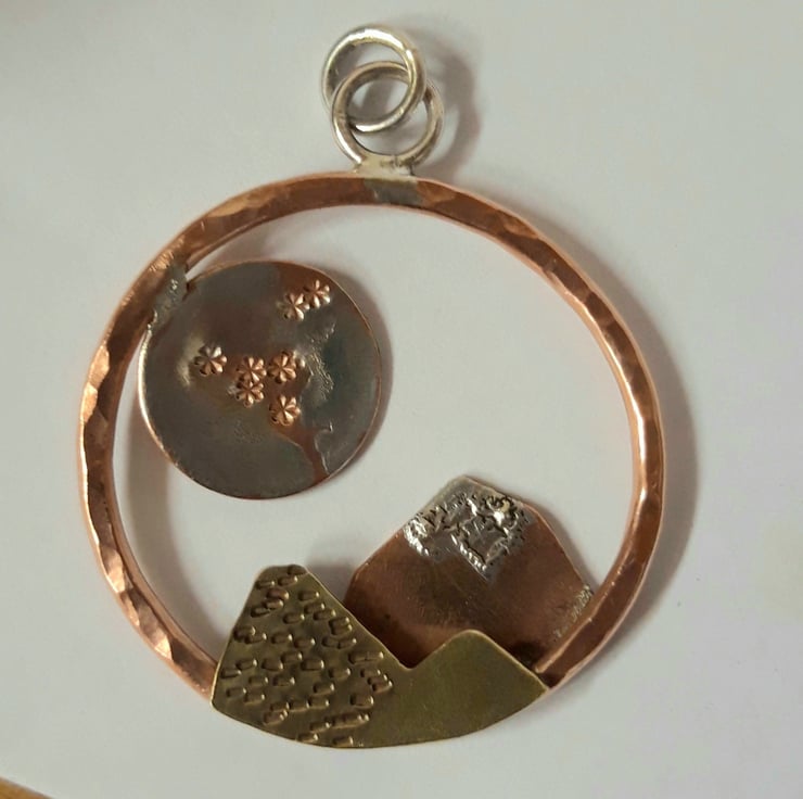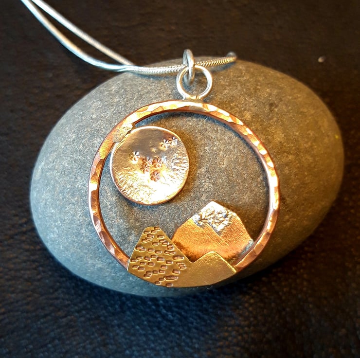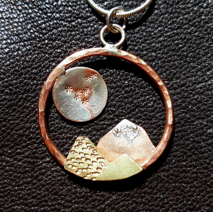 If you dream of far flung places and trekking in the hills this could be the piece of jewellery for you! Made from copper, silver and brass this little pendant (approx 3cm across) features mountains and a silvery moon - all handmade and strung on a 60cm silver plated snake chain.