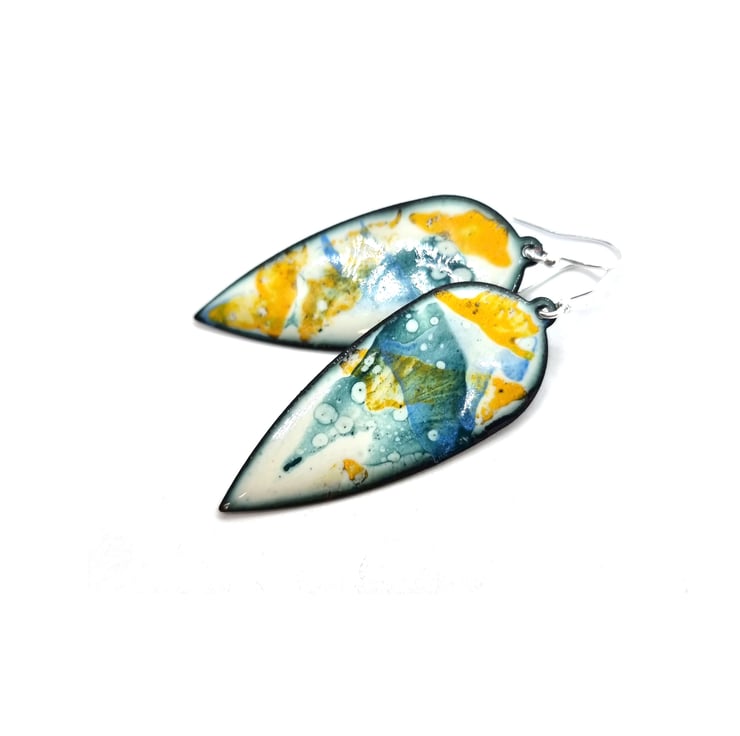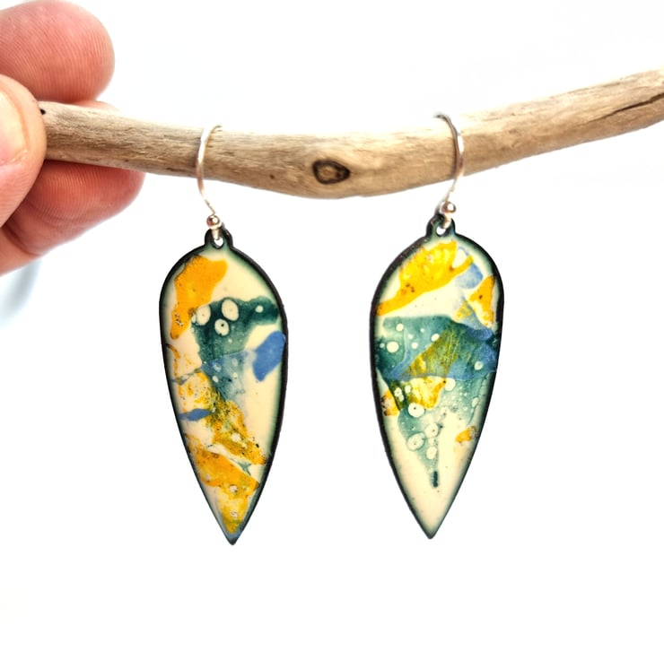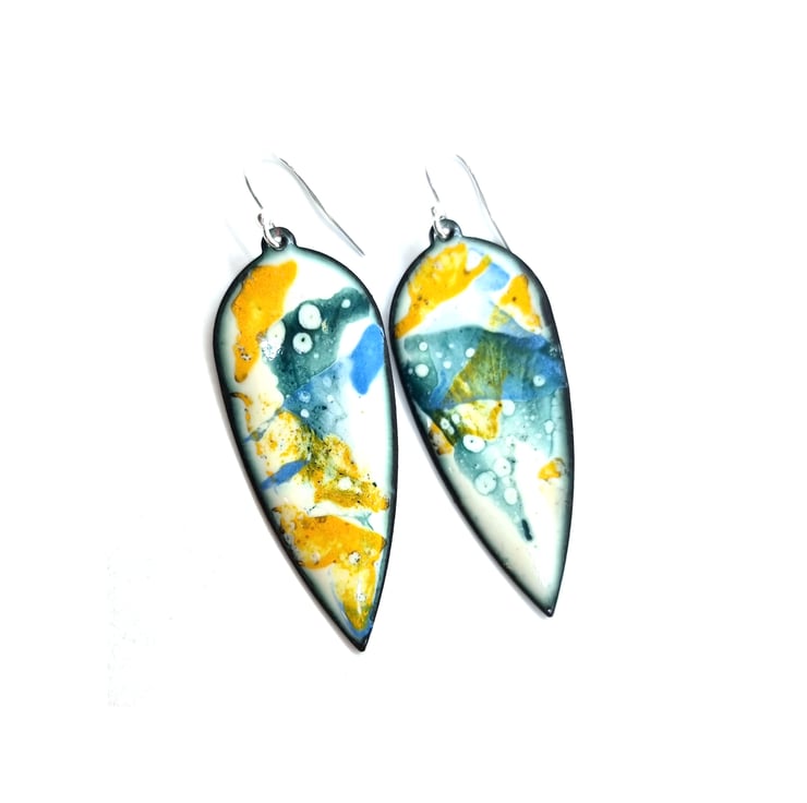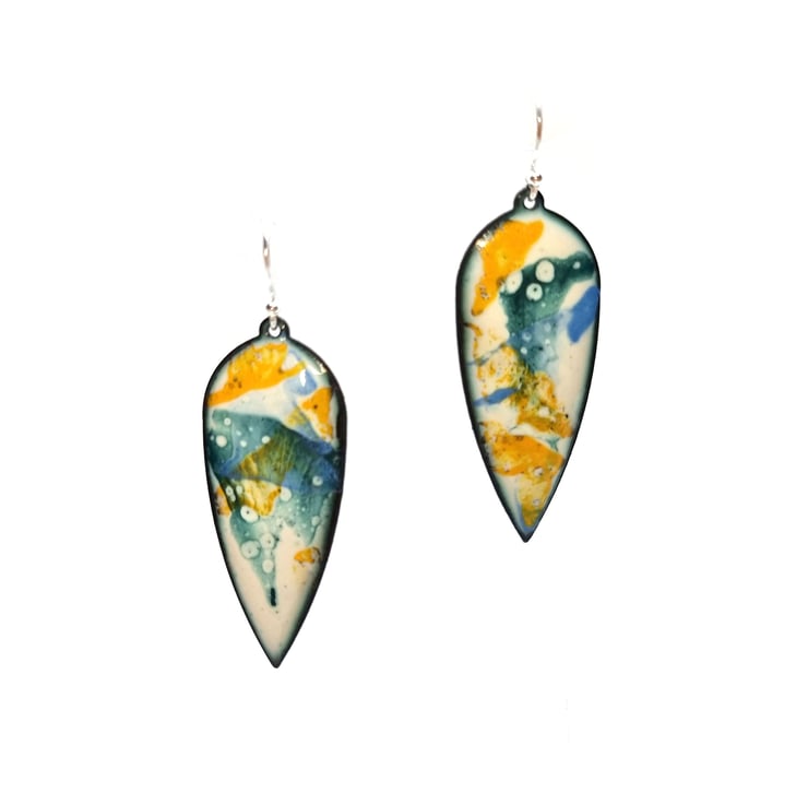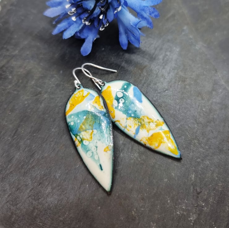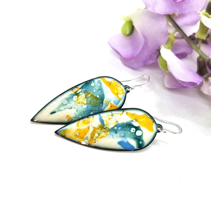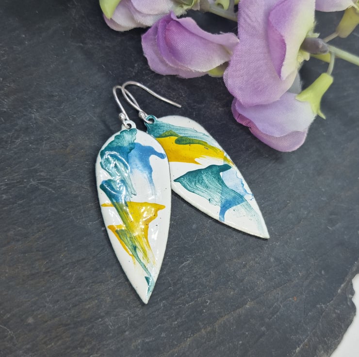 Make a splash with these beautifully colourful statement earrings. On a pretty white background, gorgeous jade green, light blue and yellow enamel has been hand-painted to create these stunning drop earrings.