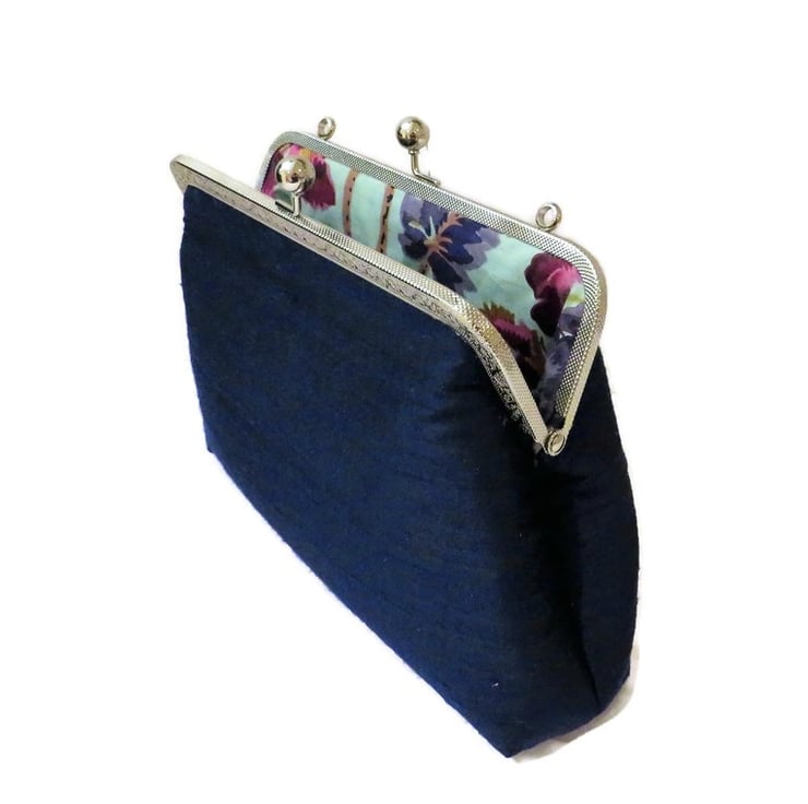 Silk dupion dark blue / navy blue handmade clutch bag