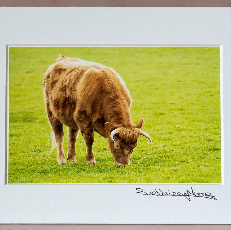 Original 4x6 mounted photograph of a cow grazing in the sunshine. I took the photo on 08/04/21 at Woodoaks Farm in Hertfordshire.