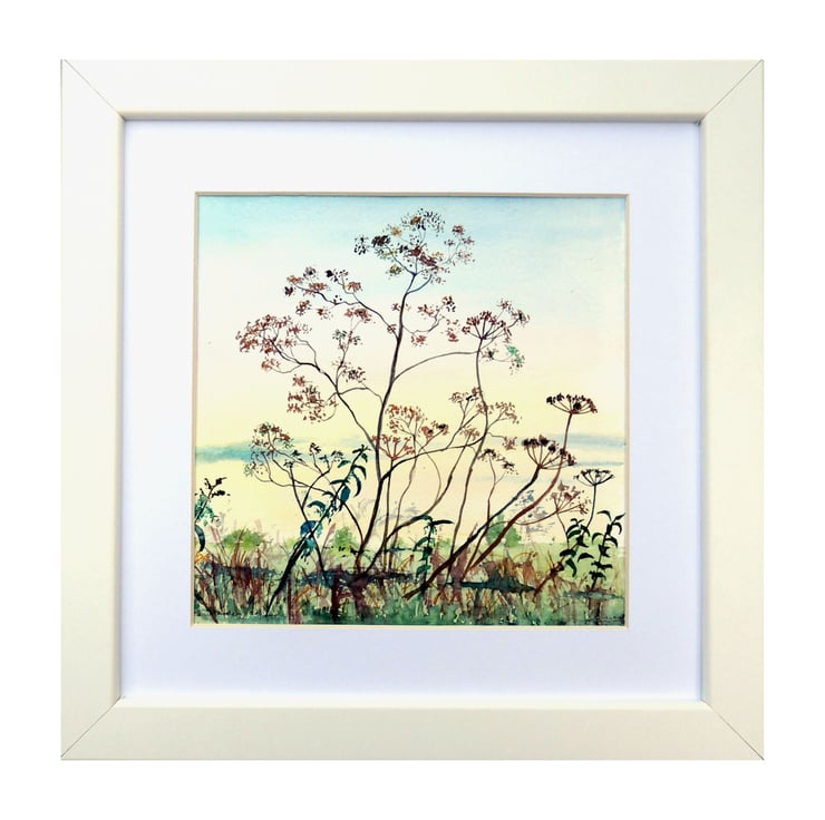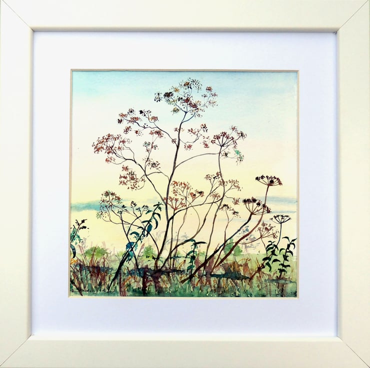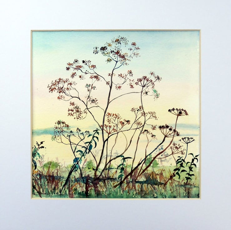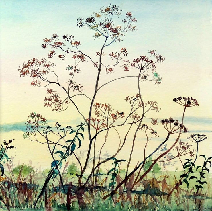 A light-hearted watercolour of cow parsley silhouetted against a summer sky in a fen landscape.