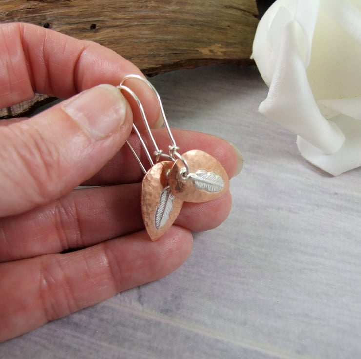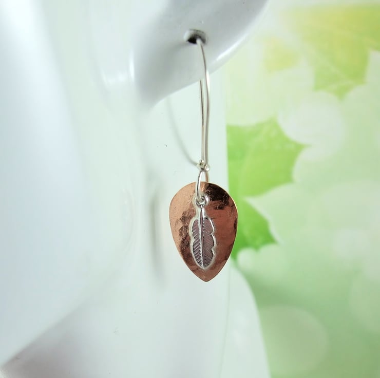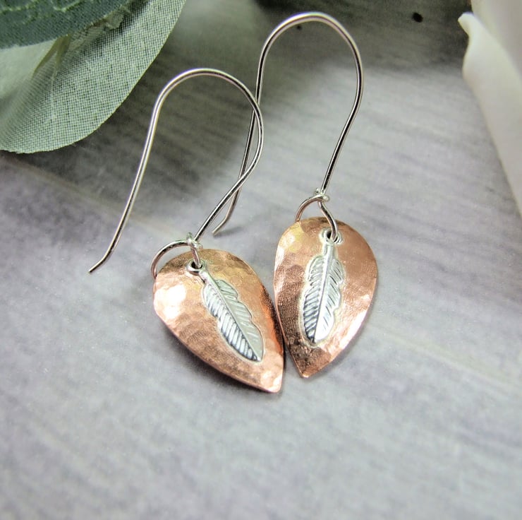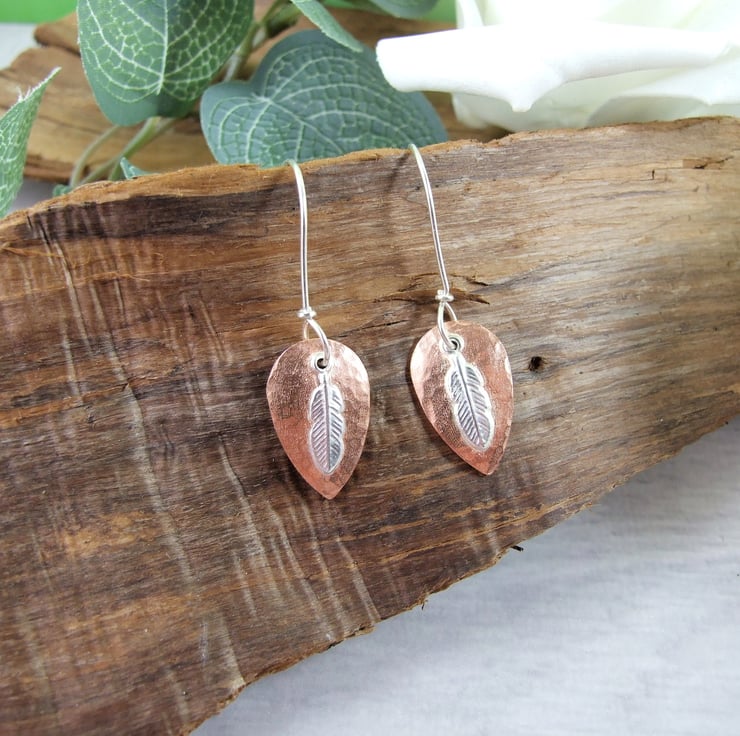 I have created theleaf shapes from copper sheet then soldered on some little fine silver feathers. Fitted securely to sterling silver ear hooks.