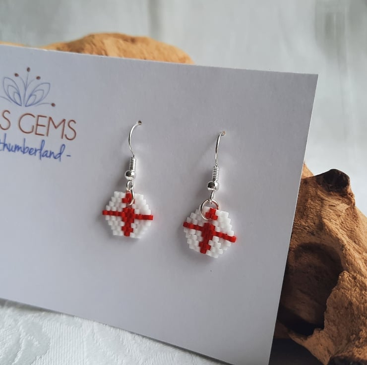 A lovely pair of light weight beadwork earrings made using Japanese Delica beads in the style of the St George's flag. They have a drop of approx. 1.3cm from the base of the ear wire and are approx. 1.5cm wide. They have silver plated findings but can be changed at check out for sterling silver for an additional charge. They would make a great accessory to any Jubilee celebration outfit.