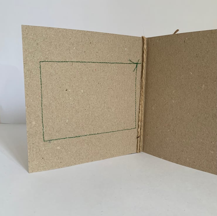 The hessian is machine stitched, using a contrasting thread, onto a plain brown recycled card. This stitching is visible on the inside of the card.