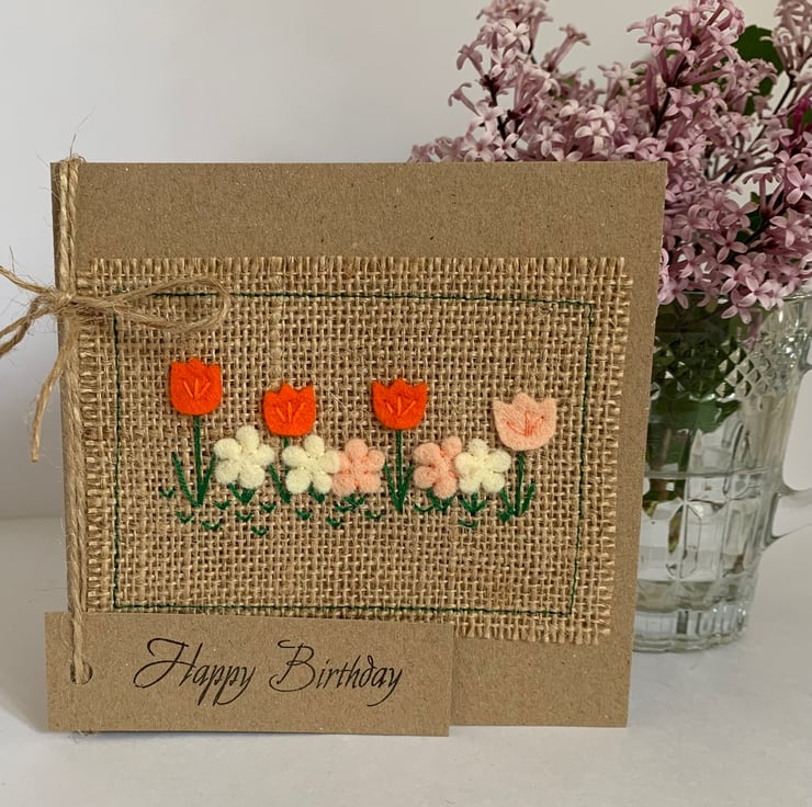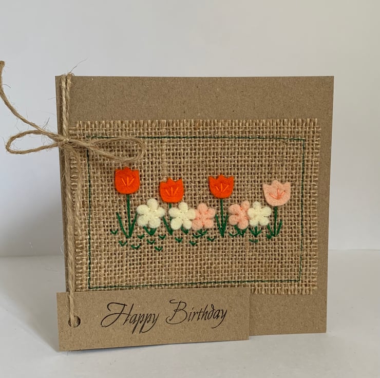 This card is decorated with delicate flowers in bright orange, peach and cream. The decoration is hand cut from 100% wool felt. It is then sewn by hand onto a hessian background.