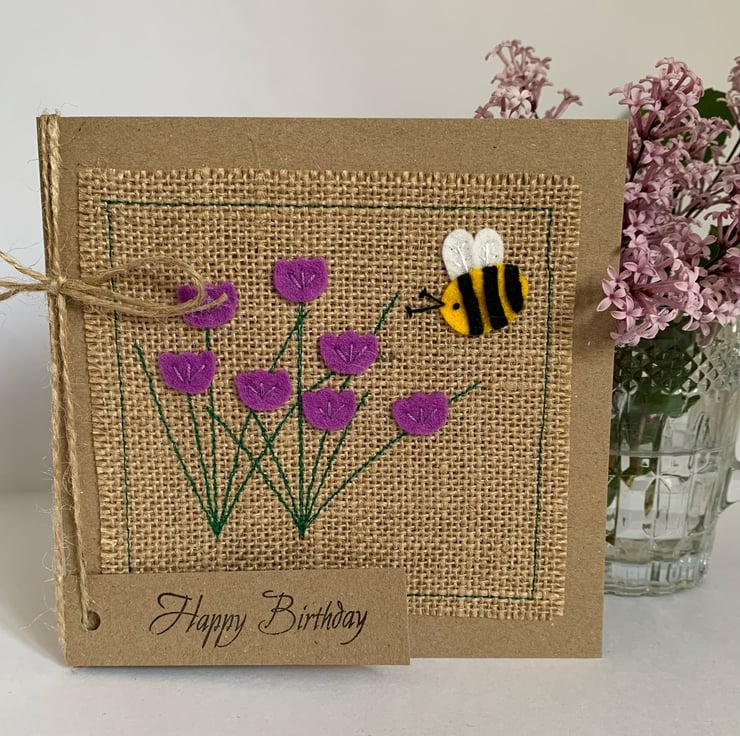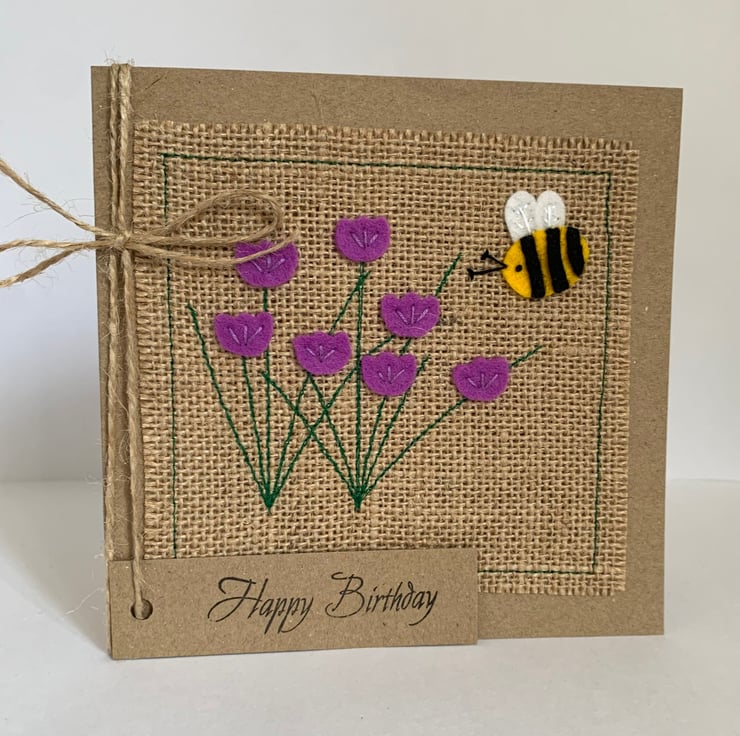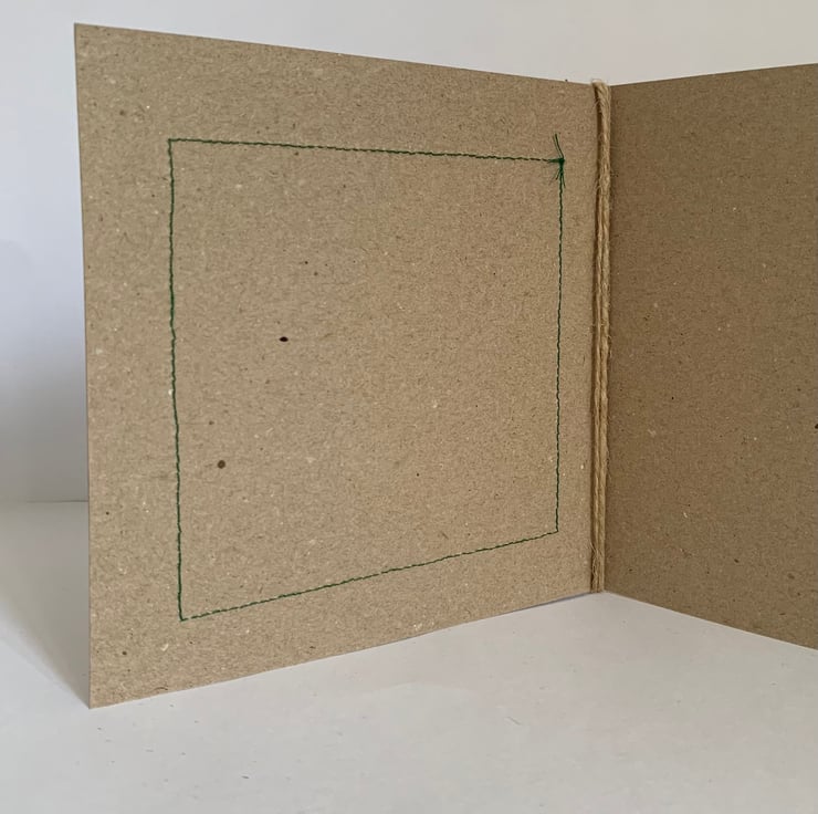 The hessian is machine stitched using a contrasting thread, onto a plain brown recycled card. This stitching is visible on the inside of the card.