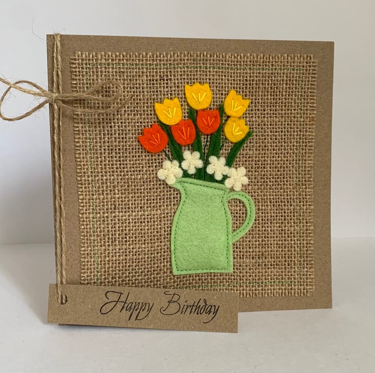 This greetings card is decorated with a mint green jug of bright orange, yellow and cream flowers. The decoration is hand cut from 100%wool felt. It is then sewn by hand and machine onto a hessian background.