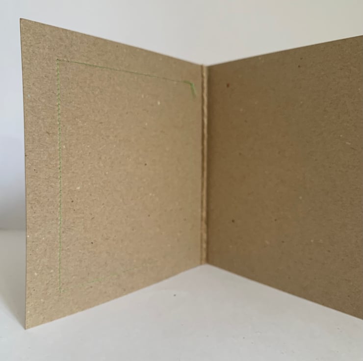 The hessian is machine stitched, using a contrasting thread, onto a plain brown recycled card. This stitching is visible on the inside of the card.