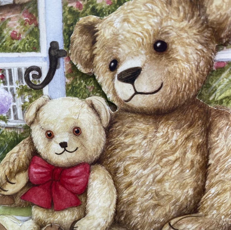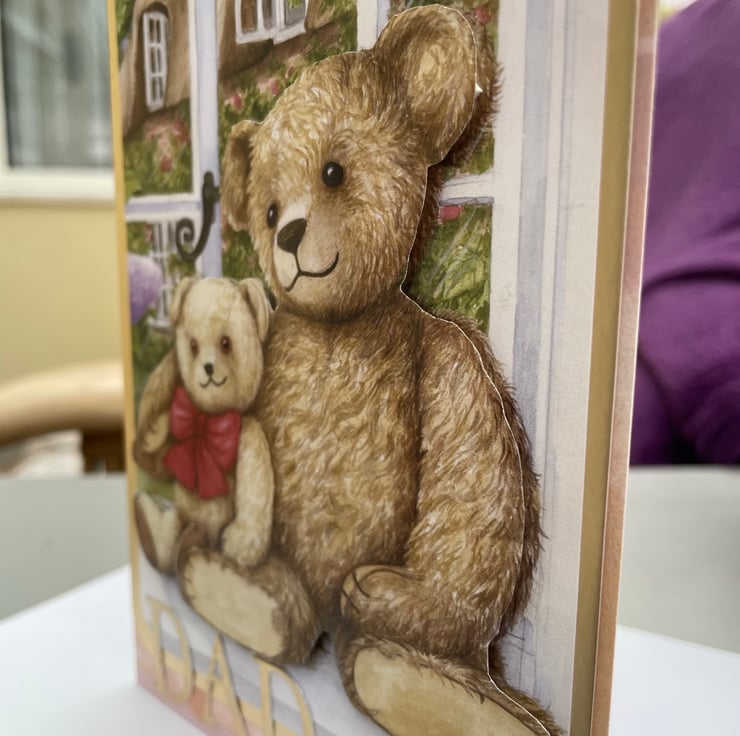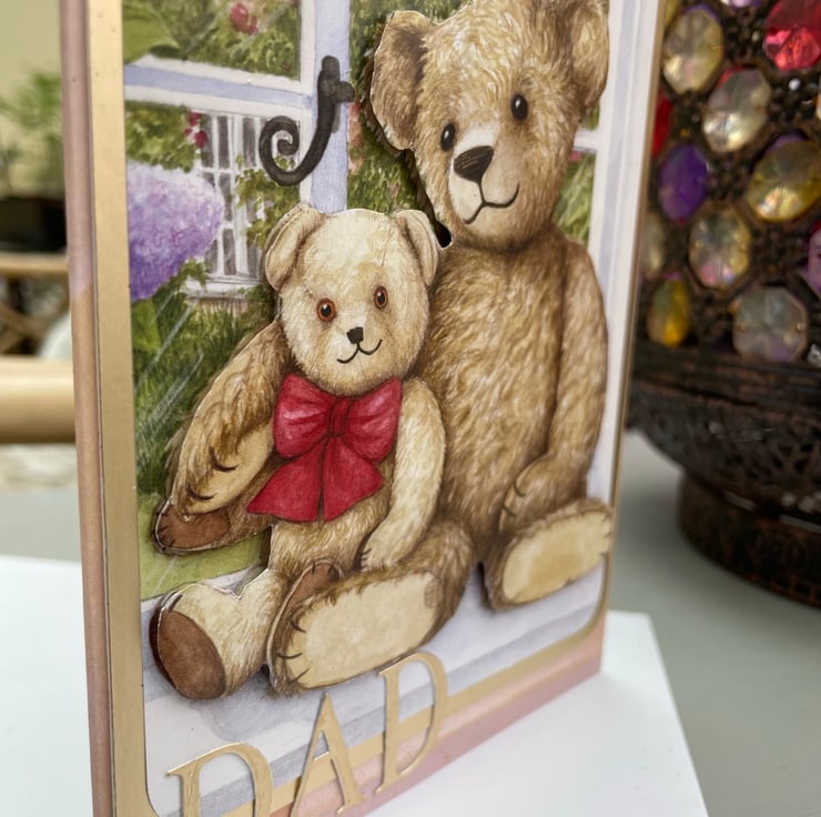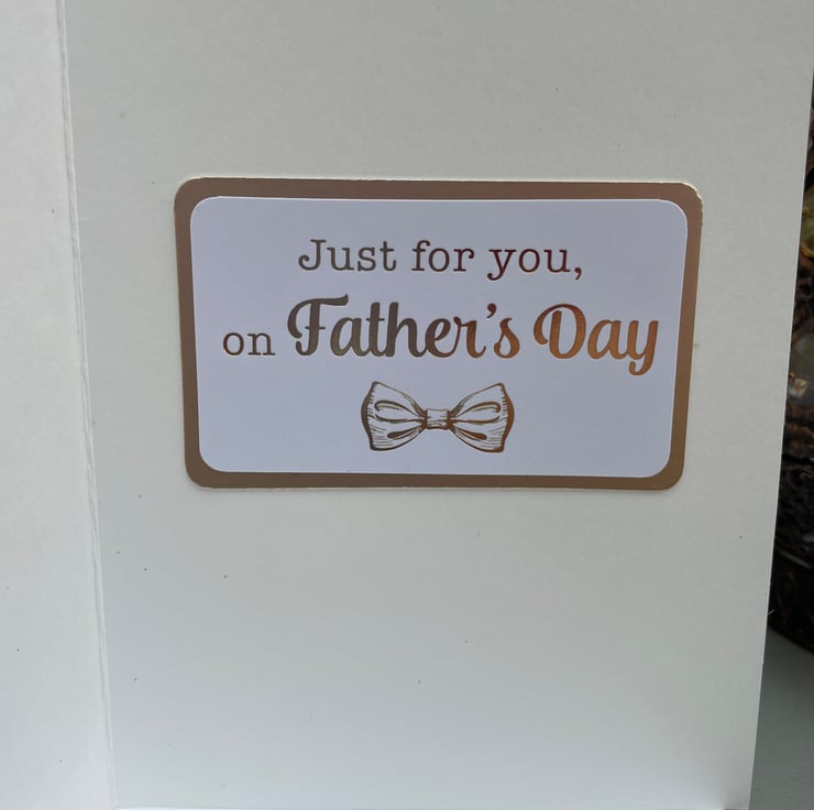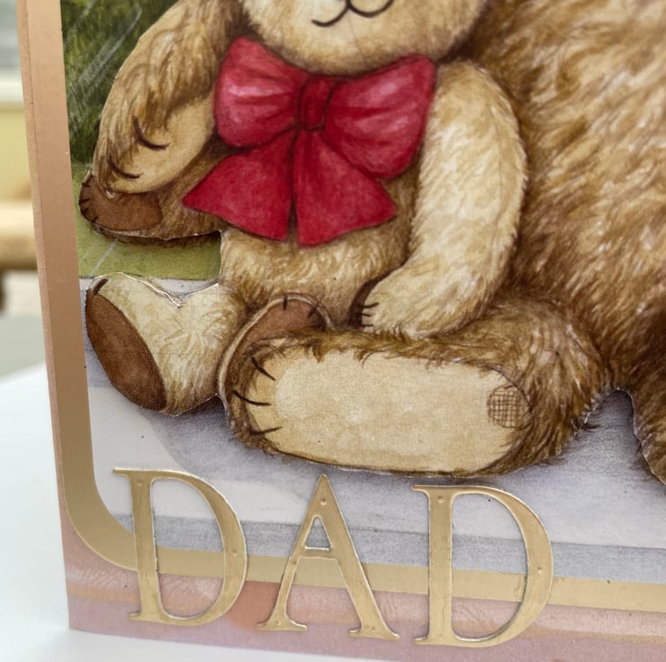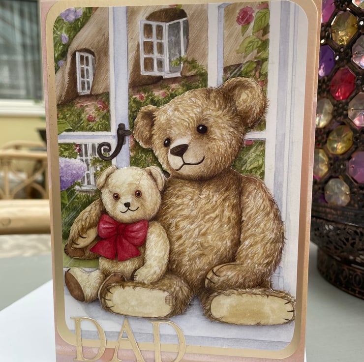 A lovely traditional card to celebreate all the Dad's out there on Father's day. This 11.5x17cm card features 2 teddy bears, one big, one small sitting on a window ledge hugging each other. The background has a fabulous thatched cottage and garden. The bears are sitting together hugging, the smallest bear has a red ribbon tied around their neck. The picture is mounted on gold card and a gold Dad is die cut and attached to the bottom. Inside the card has the greeting Just for you on Father's day and a bow tie printed in gold.