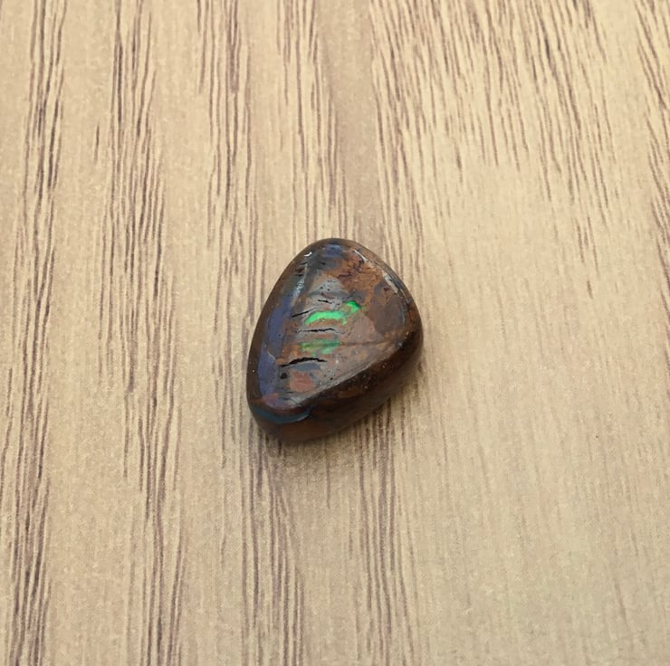 A beautiful natural flashing Australian Koroit Boulder Opal cabochon gemstone, irregular in shape with flashing iridescent neon green, purples and blues. This is a really lovely little stone, a great example of a Koroit Boulder Opal, just waiting for a jewellery designer to create something stunning.