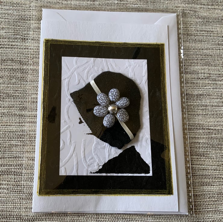 An art deco monochrome mixed media card with vintage flair and a modern twist.