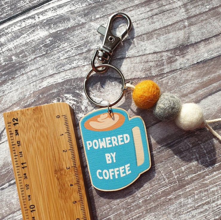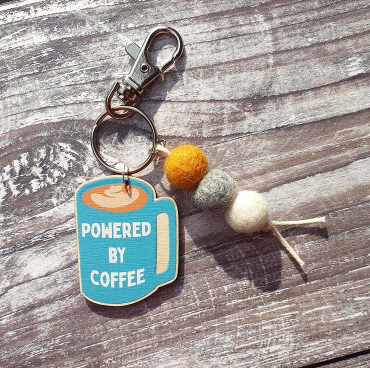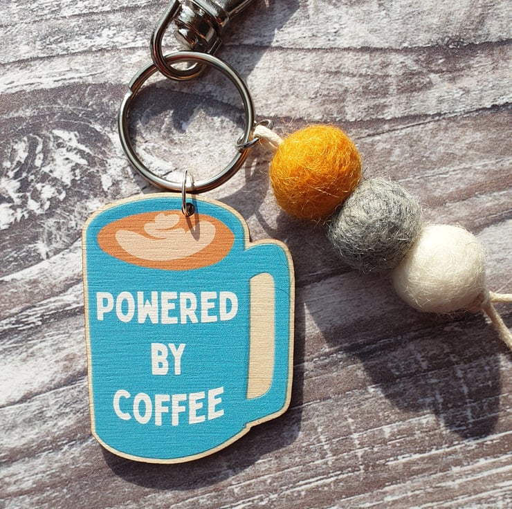 A 50mm wooden charm illustrated with an original coffee themed design by Daffodowndilly. Accompanied by a themed colour 3 felt ball charm and complete with a large lobster swivel clasp and split ring to attach to your bag or keys.