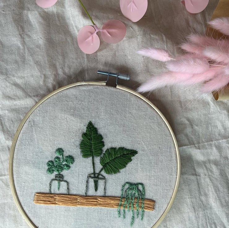 6 inch Hand Embroidered plants in pots on a wooden shelf. Perfect for any plant lover, a lovely gift for a loved one or even for yourself.