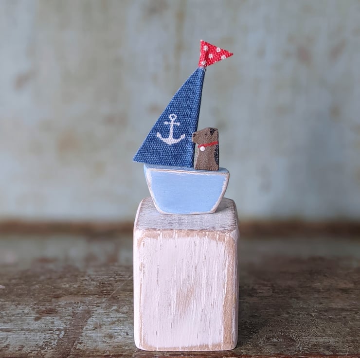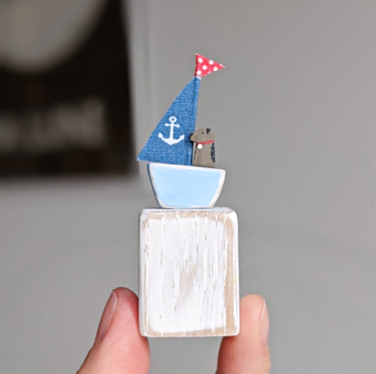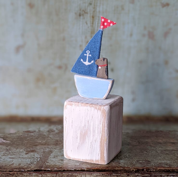 Teeny tiny Salty the seadog is off sailing in his little wooden boat. A charming nautical decoration that will sit perfectly on your shelf or desk.