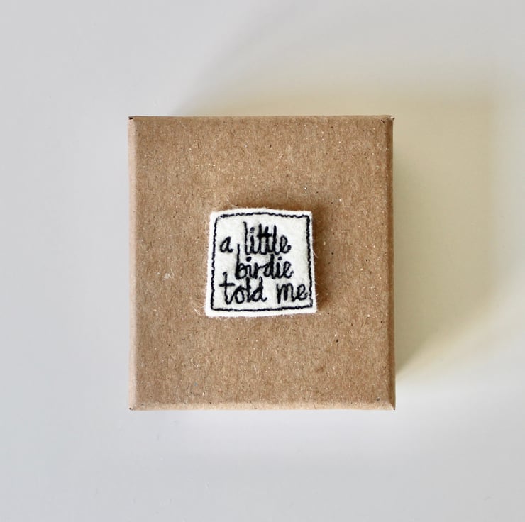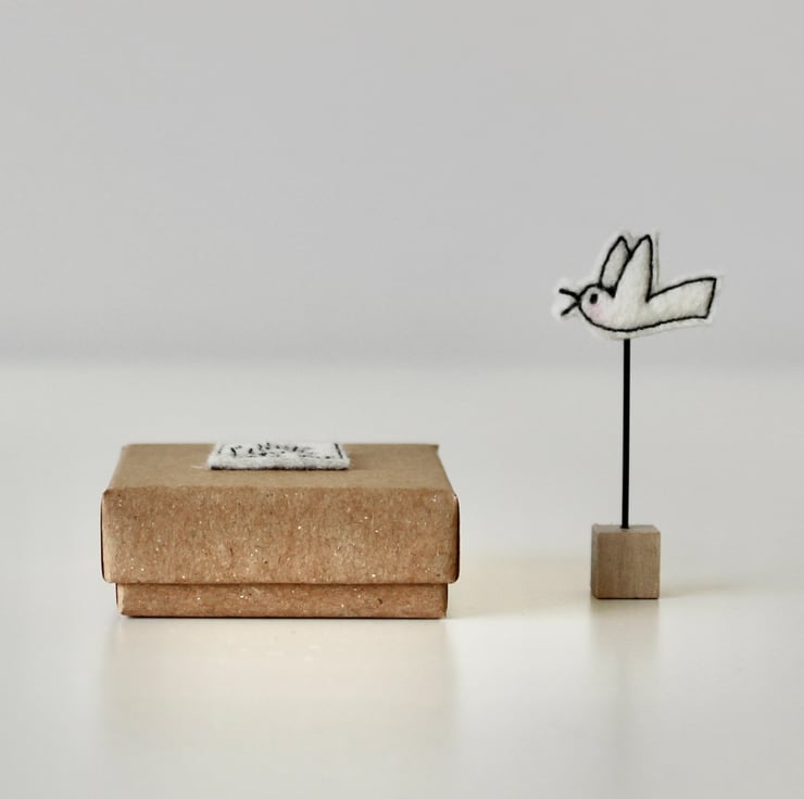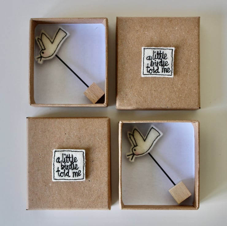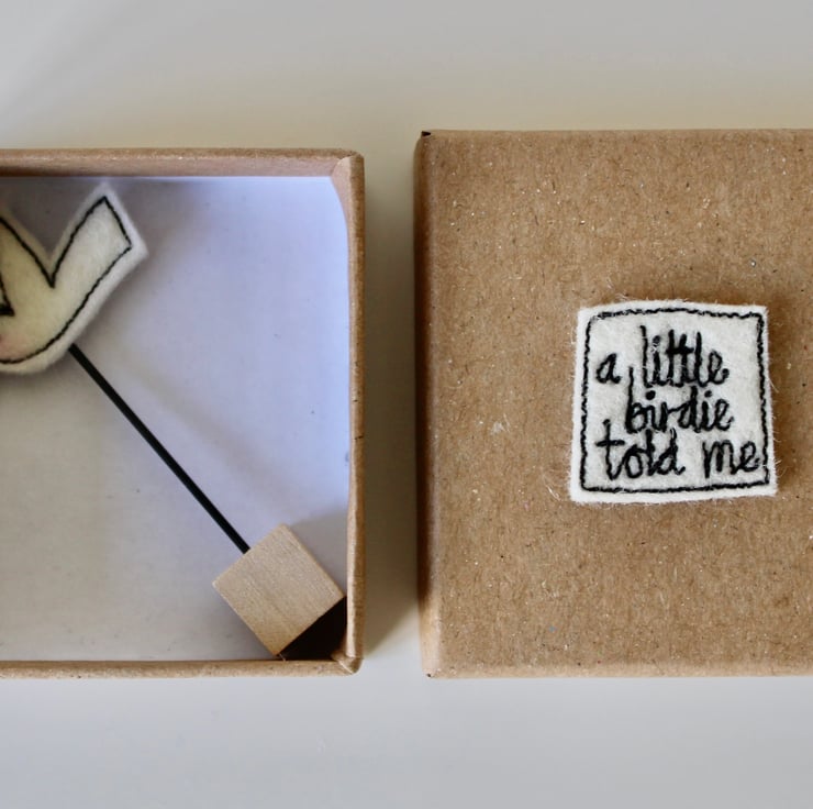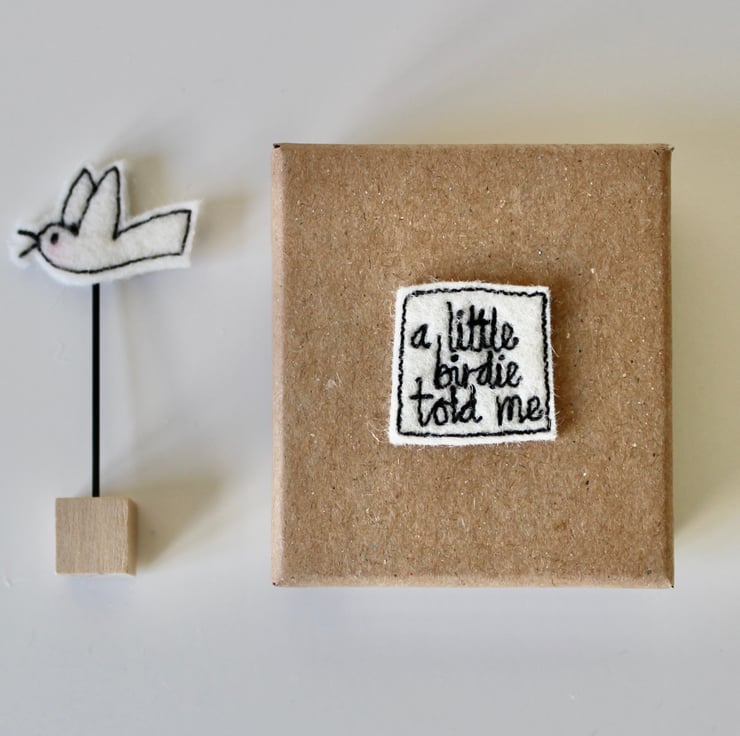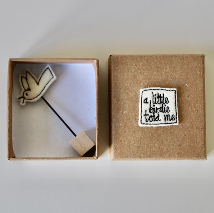 Each bird, wire stem and wooden block measures approximately 5cm by 2.5cm and is presented in a kraft coloured box (5cm x 5cm x 2cm) with the sewn words 'a little birdie told me' on the lid.