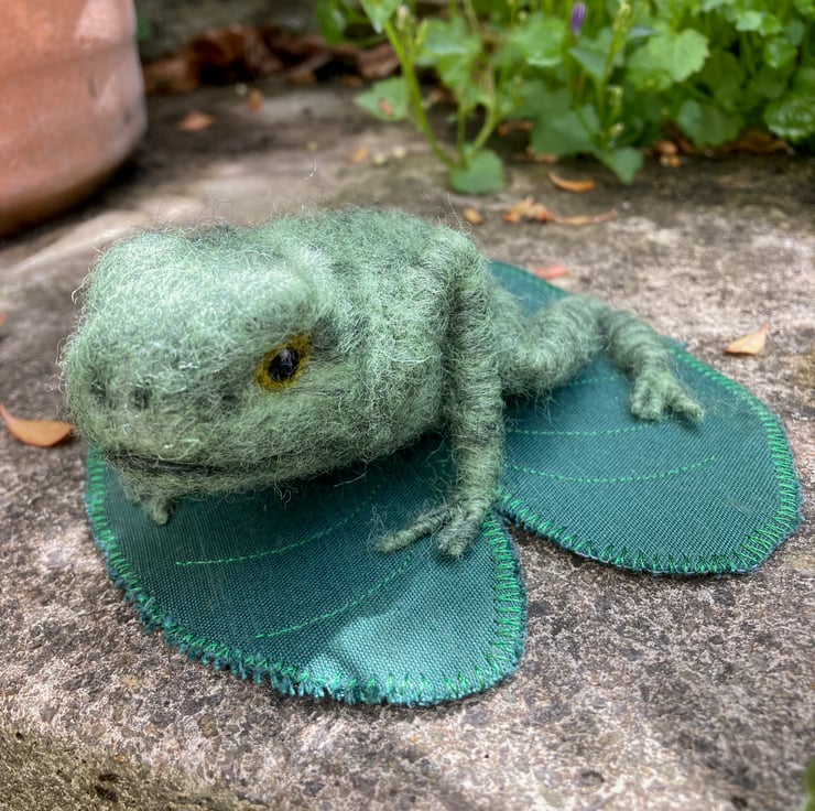 A fabulous frog sitting on a lily pad. This frog has been needle felted from woollen fibres using a barbed felting needle to sculpt the fibres into shape. The legs are formed over a wire armature. The completed frog has been mounted on a hand made stiffened fabric lily leaf.