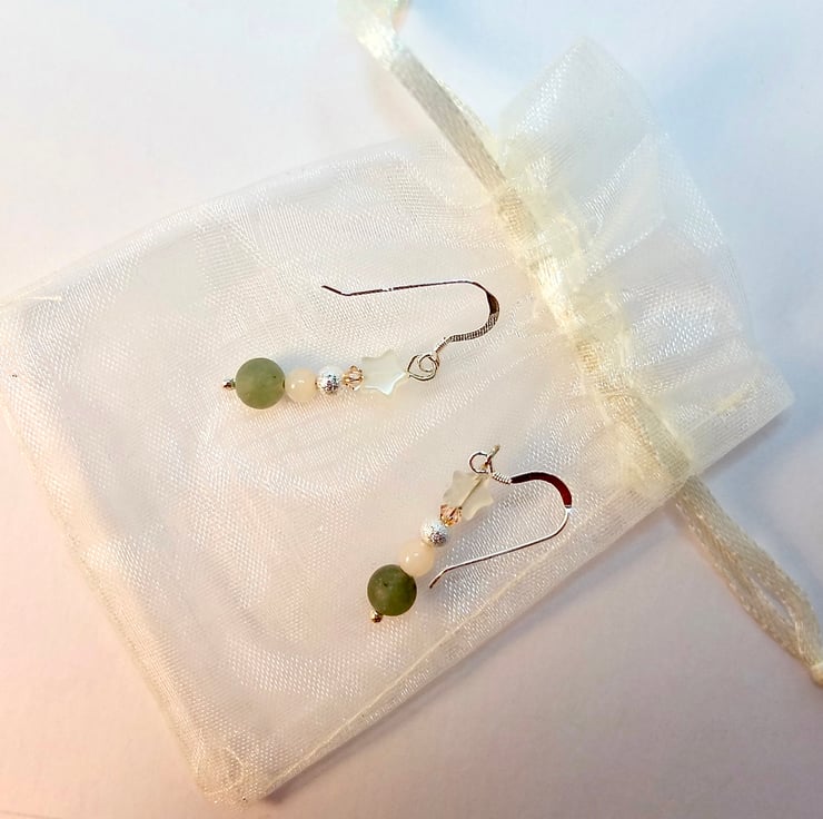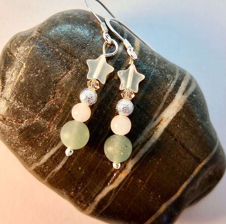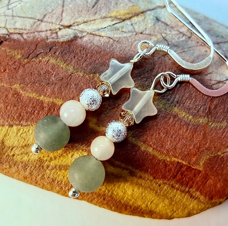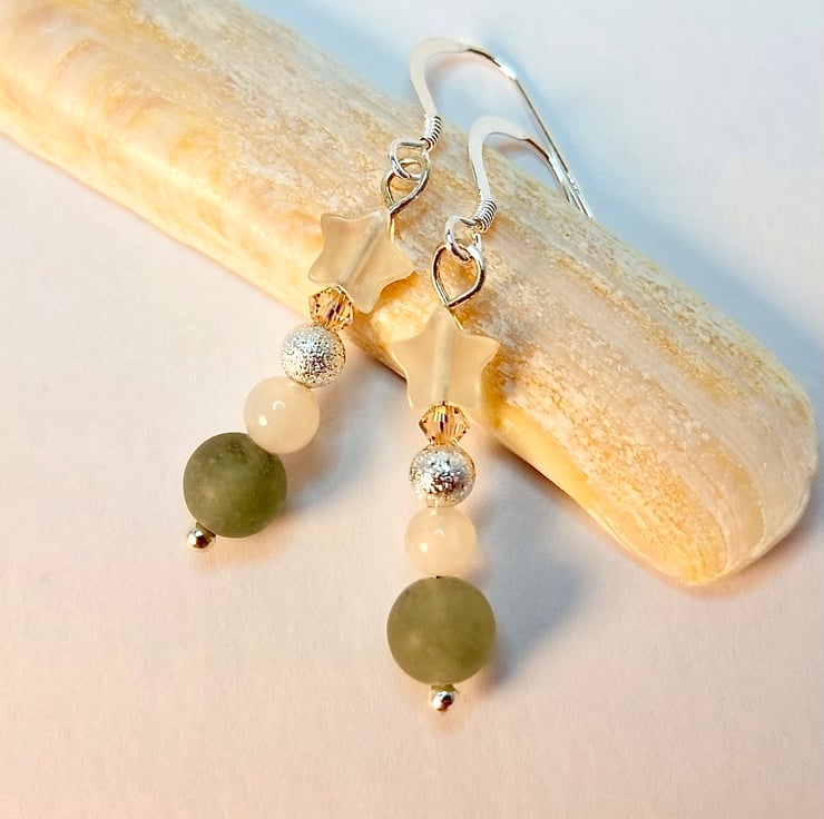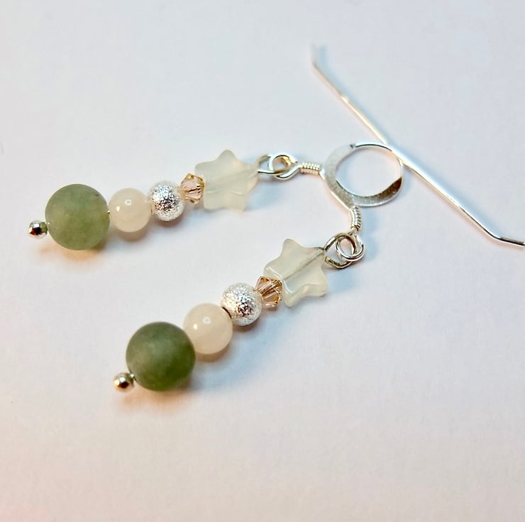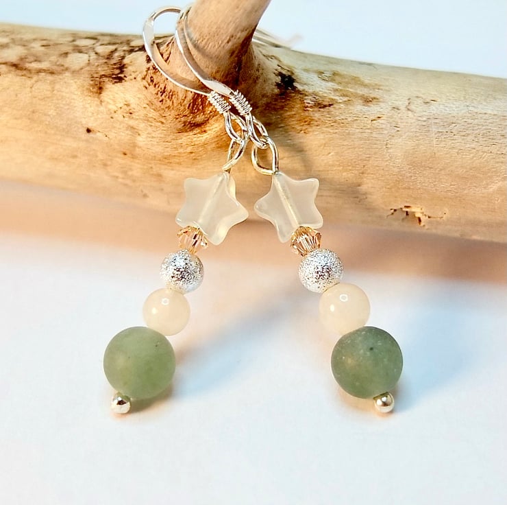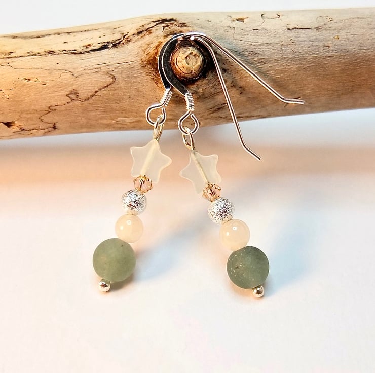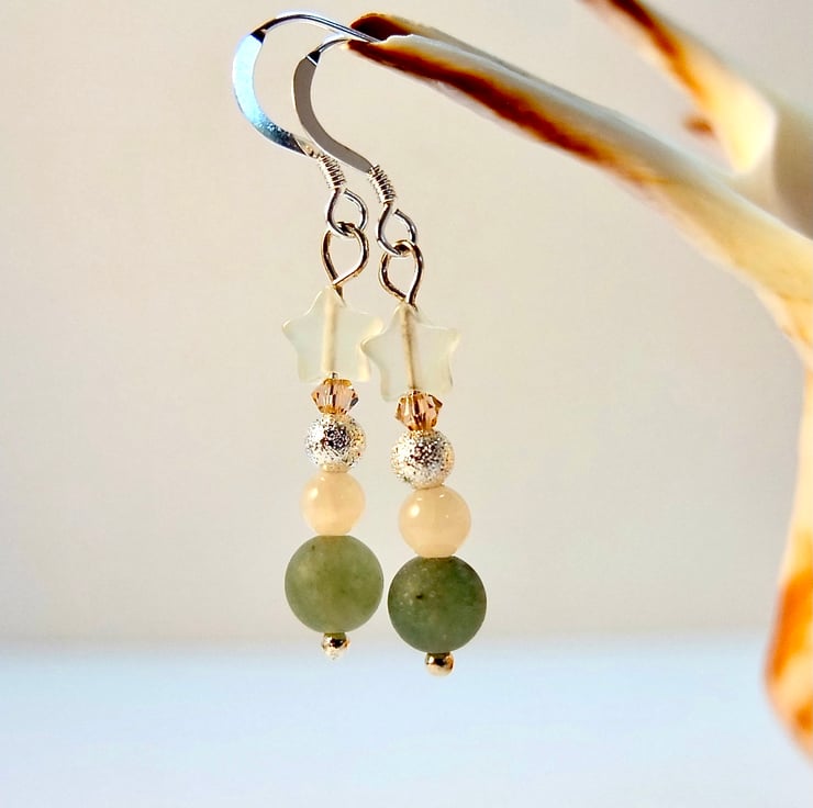 Dainty drop earrings featuring a 6mm frosted green Aventurine bead, 4mm pale peach Mashan Jade round, 4mm 'stardust', Tibetan-style silver bead, 3mm Swarovski "light peach' bicone and a 6mm Jade star.