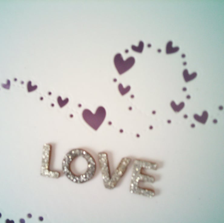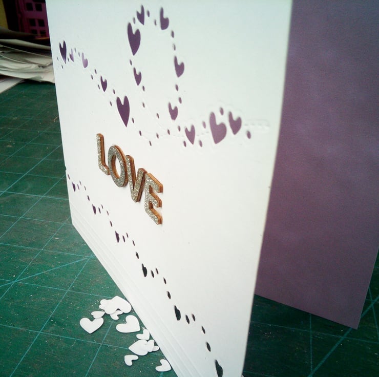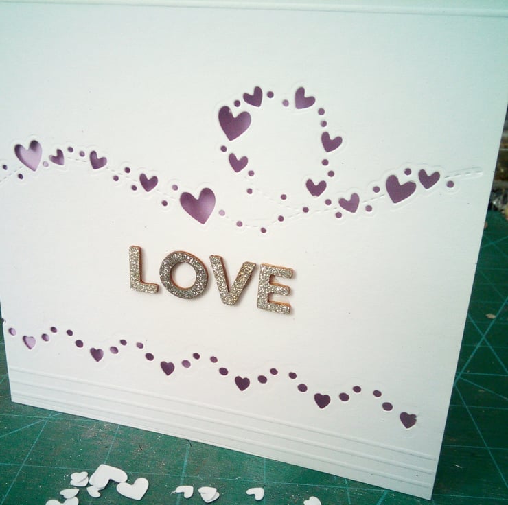 A completely handmade and uniquely designed card. Consisting of pristine white quality card which has pretty hearts die cut. LOVE added with glittered wooden letters. Thelilac I sent shows through the hearts