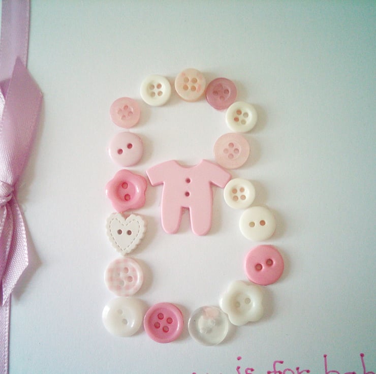 A completely handmade and uniquely designed card. Consisting of the letter B made using co ordinating buttons mounted onto pristine white quality scalloped card. Isfor baby hand written in pink ink. Silverheart and pink satin ribbon and bow