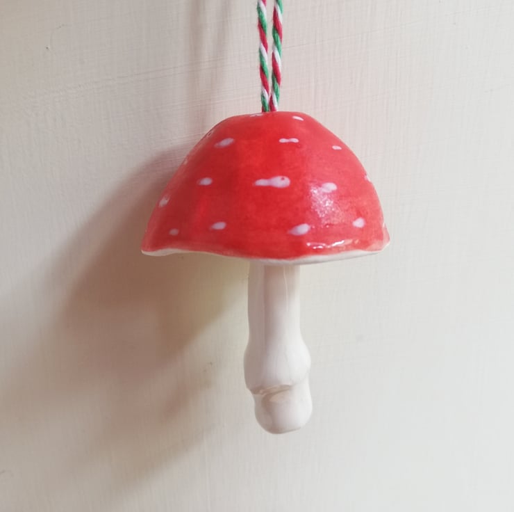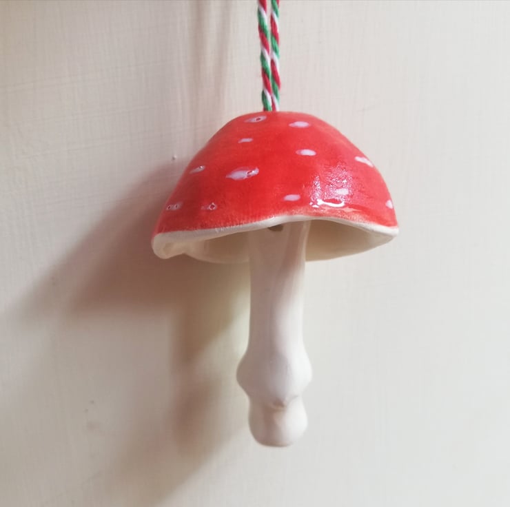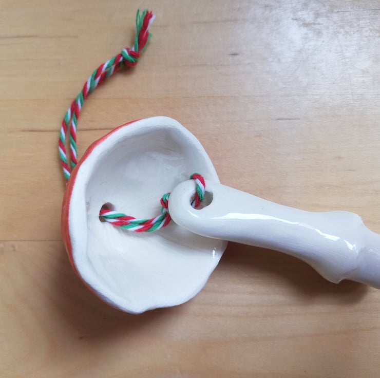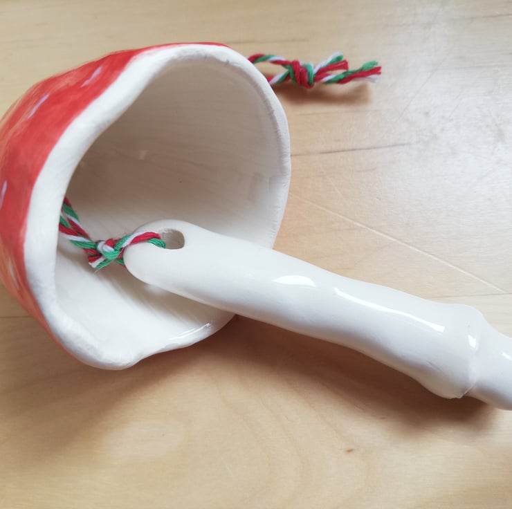 Handmade mushroom for decor. Hand painted pottery bell in the shape of a mushroom with stalk ringer. Each make a delicate tinkling sound.