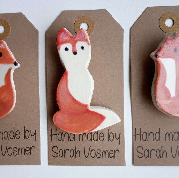 My brooches are made from a white clay, which really enhances the coloured underglaze of the foxes coat. The brushstrokes may vary slightly as they are all hand painted, then fired for a second time with a transparent glaze, which really brings out the colours.