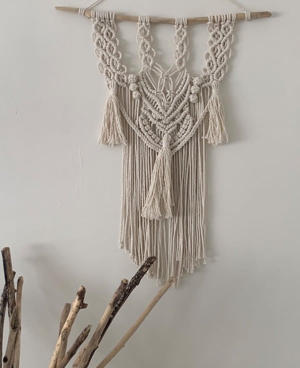 A delicate piece of macrame which will suit any decor and/or make a wonderful gift. I have crafted this piece using natural 3mm cord and it hangs on a hazel wood branch. In macrame, the spaces are important too and I wanted this to have a softer and more Lacey appearance. I hope you like it :)
