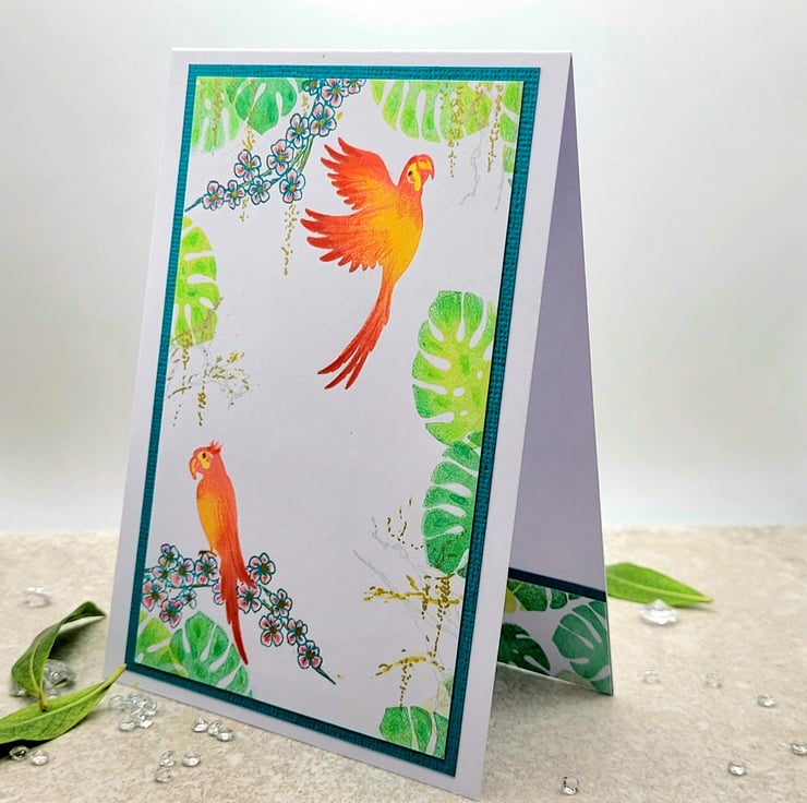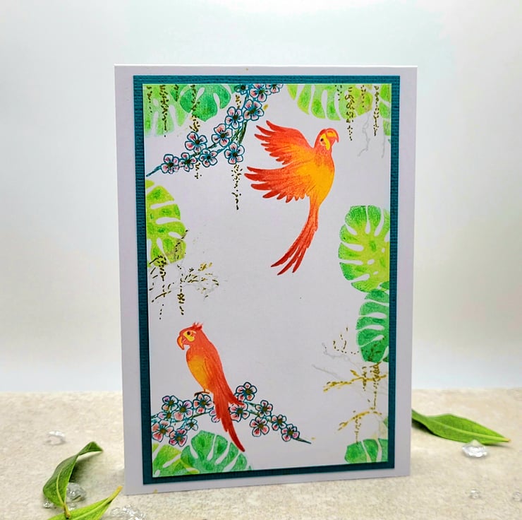 The card measures 10.5 x 15 cms and is top folding. Handmade from extra white chlorine free card, layered with a panel of turquoise linen card. There are tropical birds, blossom and leaves in zesty shades of green. Details have been added with gold ink and the blossoms are painted with ink and shimmer pen.