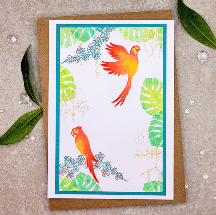 An original handmade blank card with colourful hand-stamped tropical birds and leaves. Great for birthday greetings, thank you messages or notes. This one of a kind card is decorated inside and out.