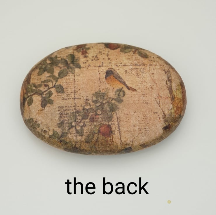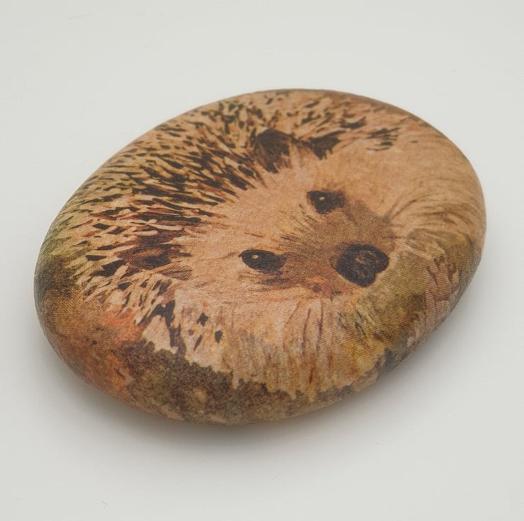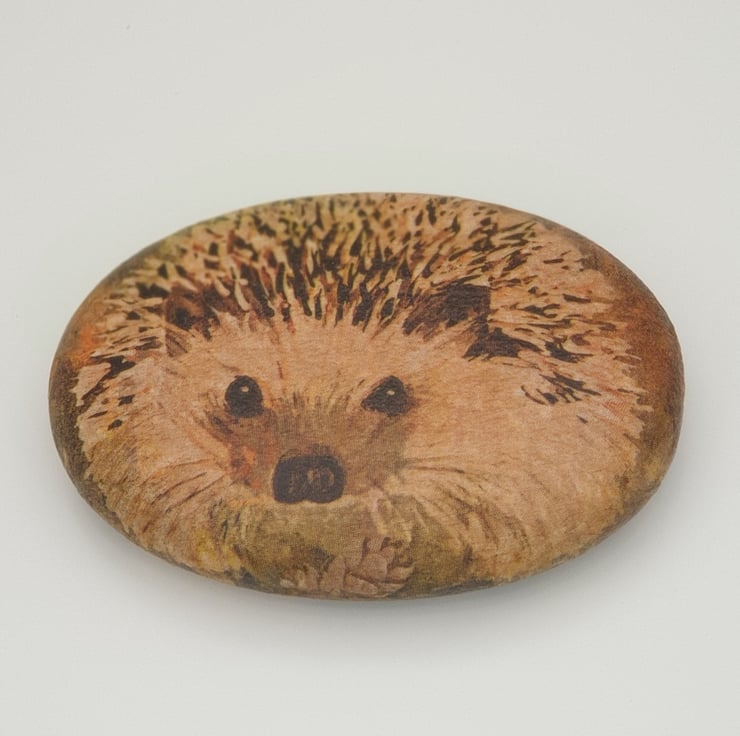 Wooden pebble featuring a cute hedgehog. The pebble has been decoupaged on both sides and finished with several layers of sealer. This decorative pebble would make a lovely addition to your home decor or the perfect gift for a hedgehog or nature lover.
