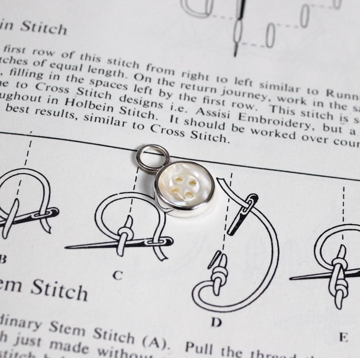 The larger loop (or finding/jump ring) measures 5mm inner diameter and makes the button slip on and off necklaces allowing for easily interchanging of charms etc. The positioning of the loop on the button means when hung it will sit next to a thimble or reel for example comfortably. Please note this positioning and what the button will be added to when purchasing.