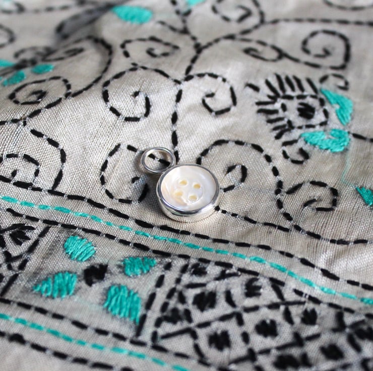 This vintage button charm is part of a series of single components (charms) on offer. Find also a cotton reel and a thimble.