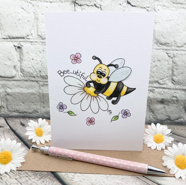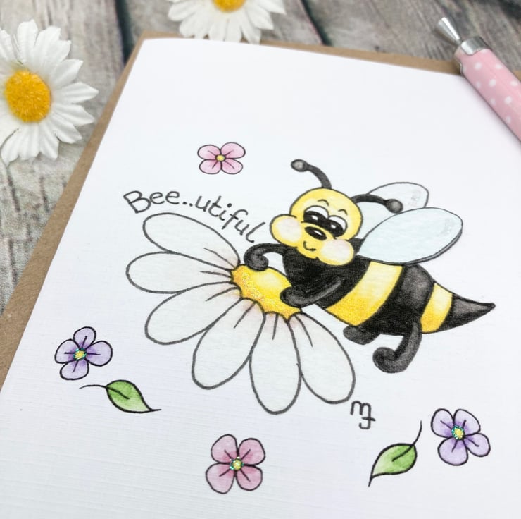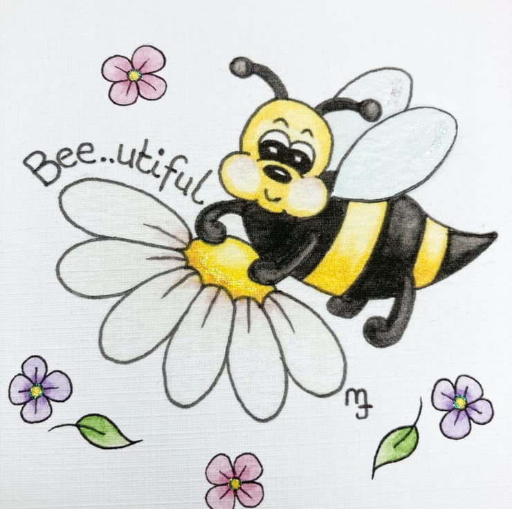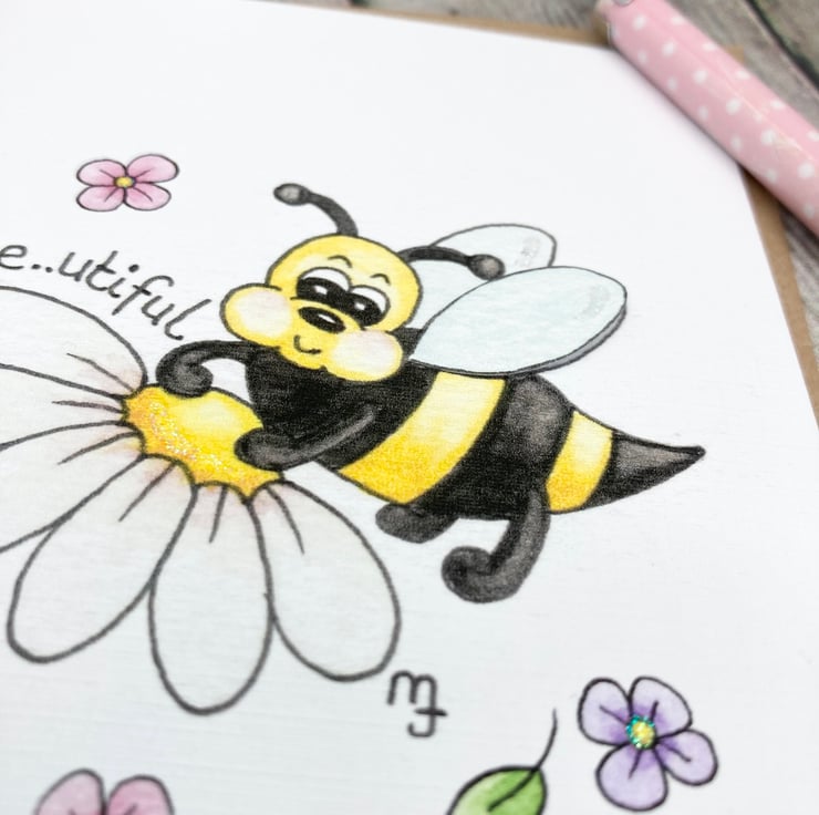 This cute bee card has been designed using my own original illustration. The image has been printed out onto good quality white linen embossed card and decoupaged up in parts. I have also added a little glitter detail.