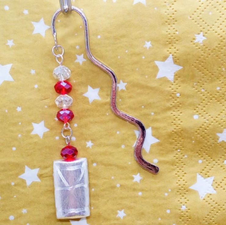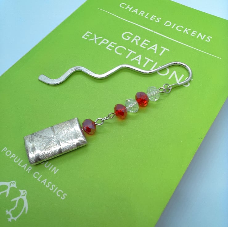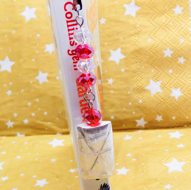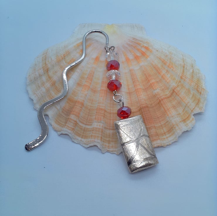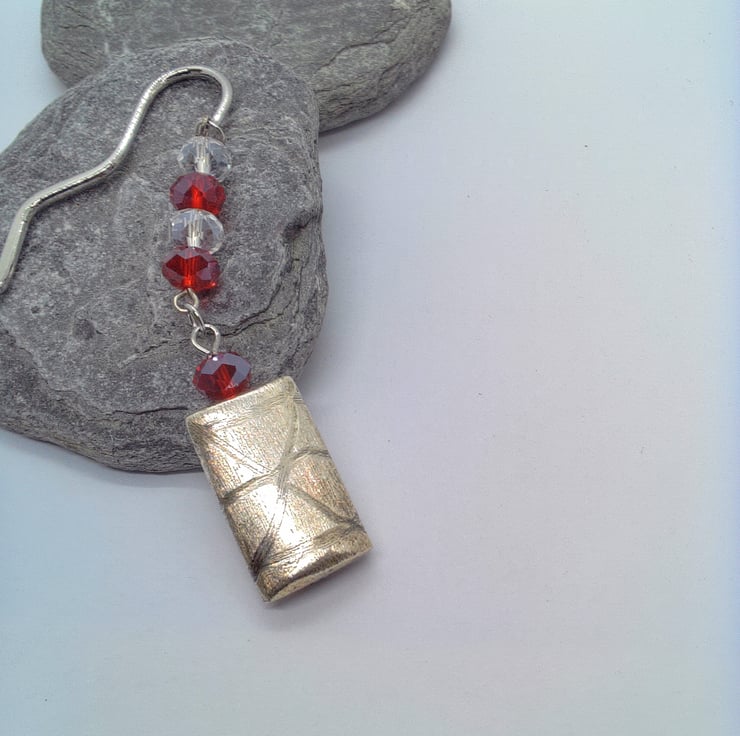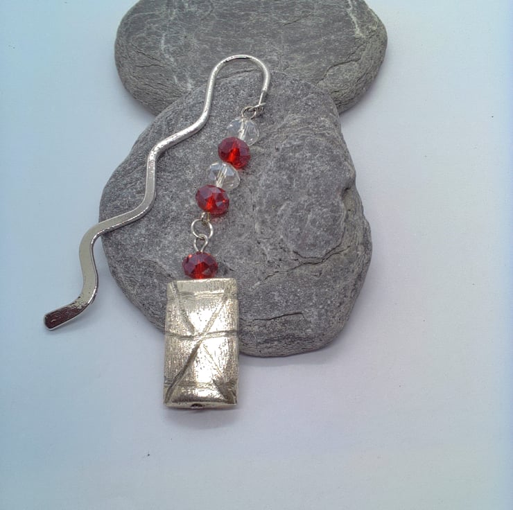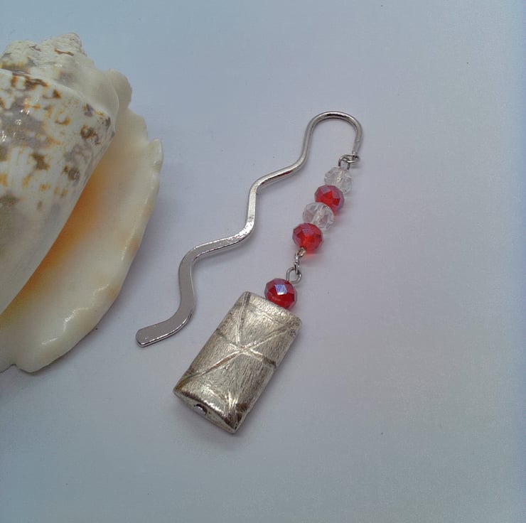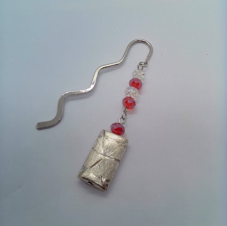 The bookmark is silver plated and it has a curvy shape. It has 6 mm red and clear glass crystal beads with a silver plated 25 mm x 18 mm silver rectangle shape with a brushed pattern overlayed with an etched design. This beaded section is 7.5 cm long. The Bookmark is 8 cm in in length.