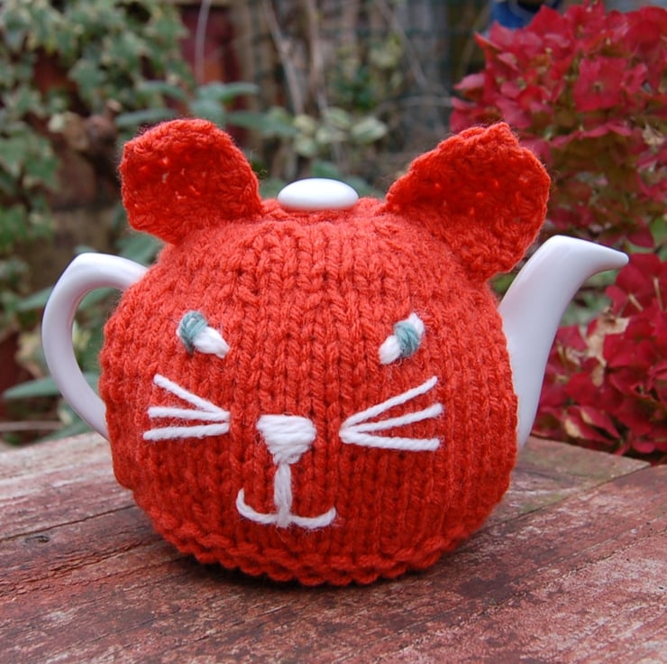 A gorgeous knitted cat cosy, perfect for keeping your tea hot.
