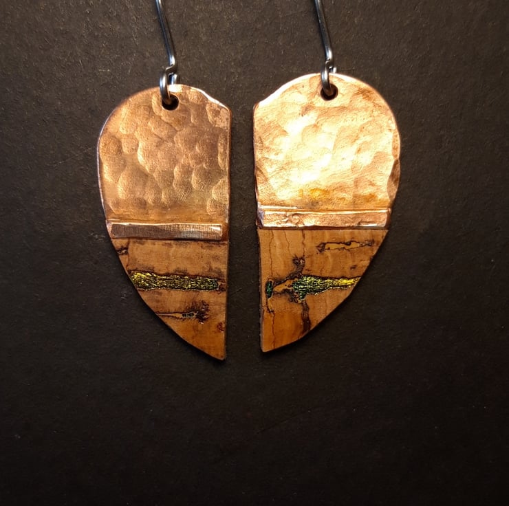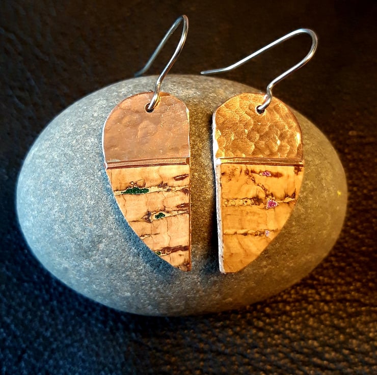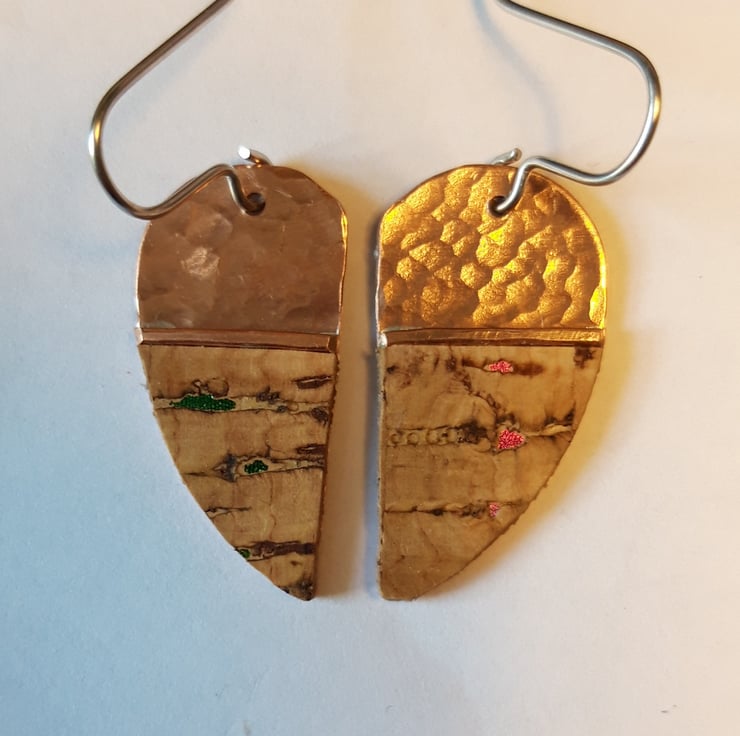 These wing shaped earrings are approx 2.5cm in length. They feature hammered copper and cork with shards of coloured foil. They are strung on surgical steel loops. The earrings are coated in jeweller's lacquer to maintain their colour and shine