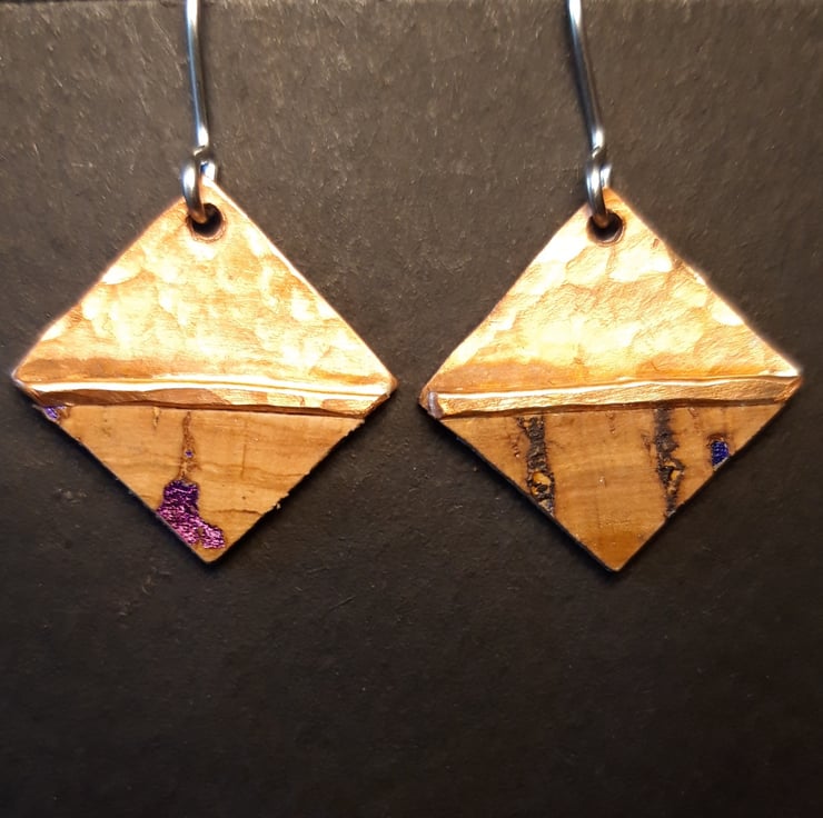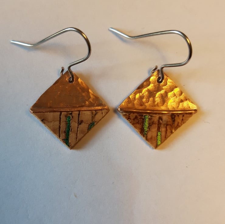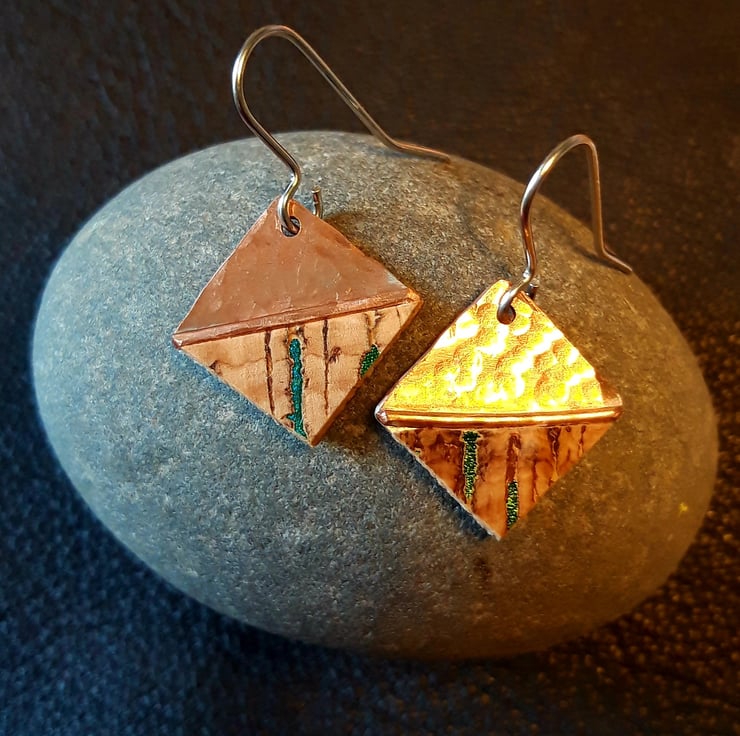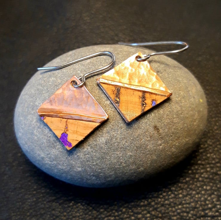 These diamond shaped earrings are approx 1.5cm in length. They feature hammered copper and cork with shards of purply/pink or green coloured foil. They are strung on surgical steel loops. The earrings are coated in jeweller's lacquer to maintain their colour and shine.