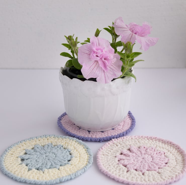 I like to have a mat under my houseplant pots and vases to protect furniture from scratches and drips; so I crocheted up this collection of pretty cotton coasters in various colours to match my chosen flower or plant colours.