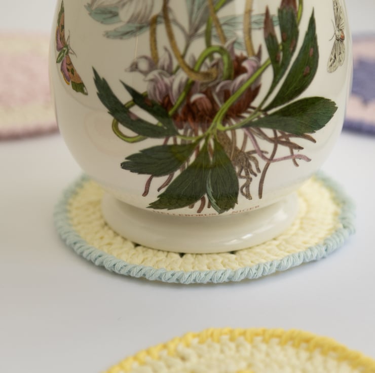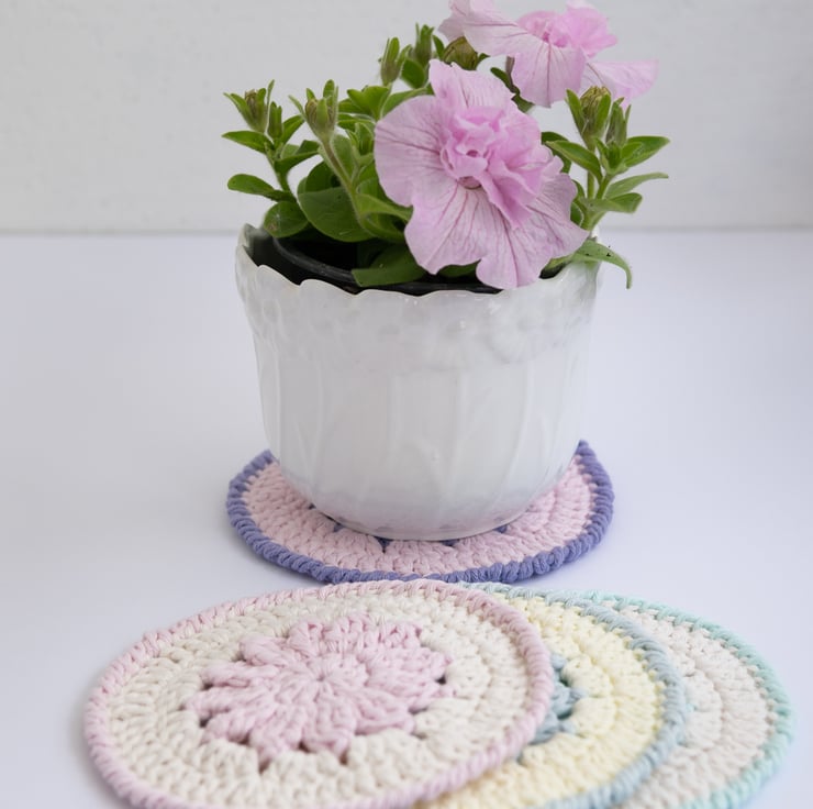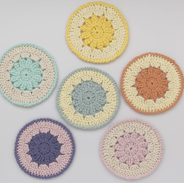Each coaster is made with 2 colours; a darker pastel central and edge colour, with a paler pastel or neutral middle section. They are made with cotton Aran yarn which makes them sturdy enough to protect surfaces whilst still being soft and pretty.